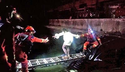很快,6米长的拉梯从岸边伸出,搭在轿车的引擎盖上,一位消防员顺着梯子爬到车顶。“来,抓住我的手!”消防员协助甘女士打开车门,将她拉上车顶,扶上拉梯,其他消防员在岸边接应。经过约15分钟救援,甘女士脱险上岸。