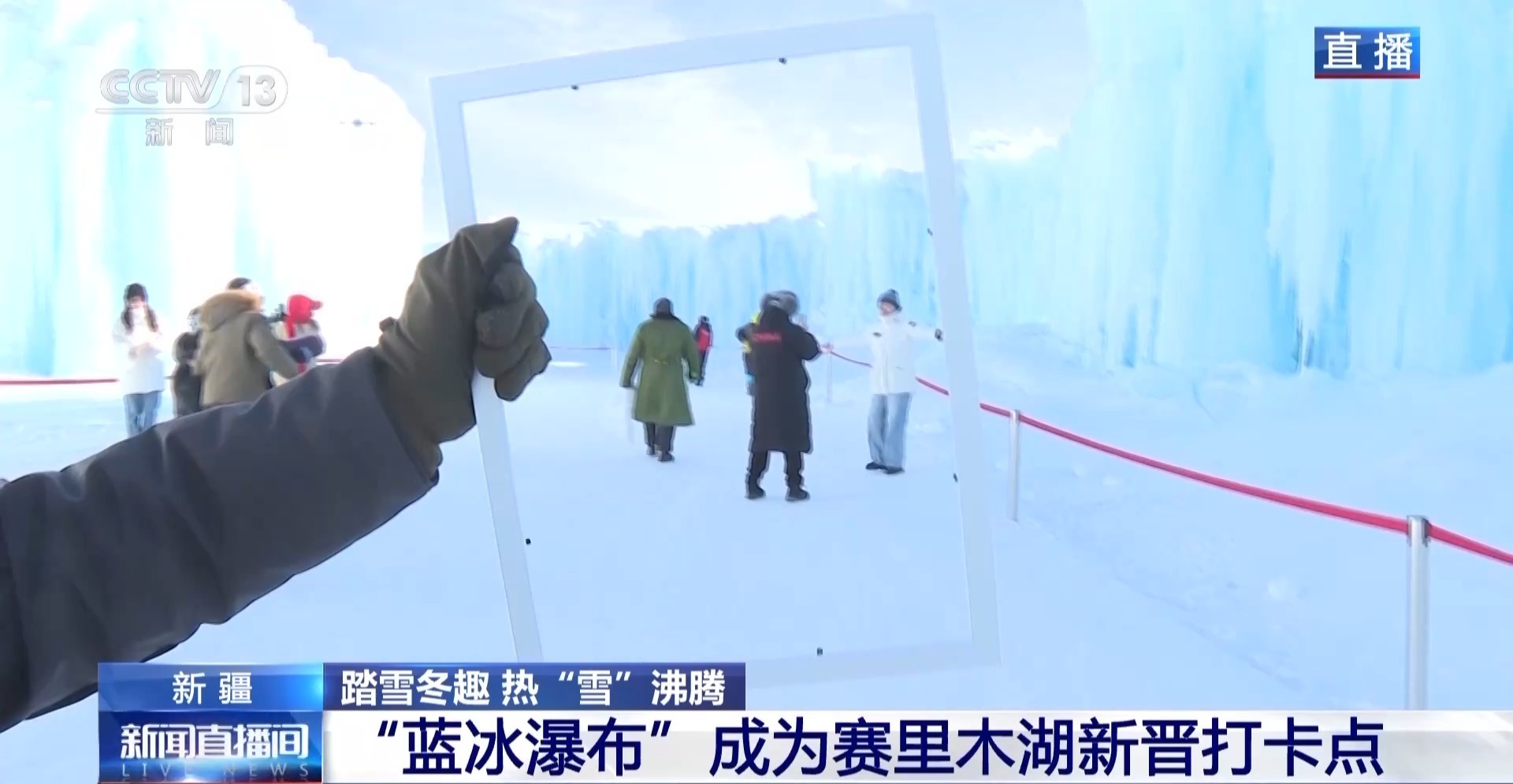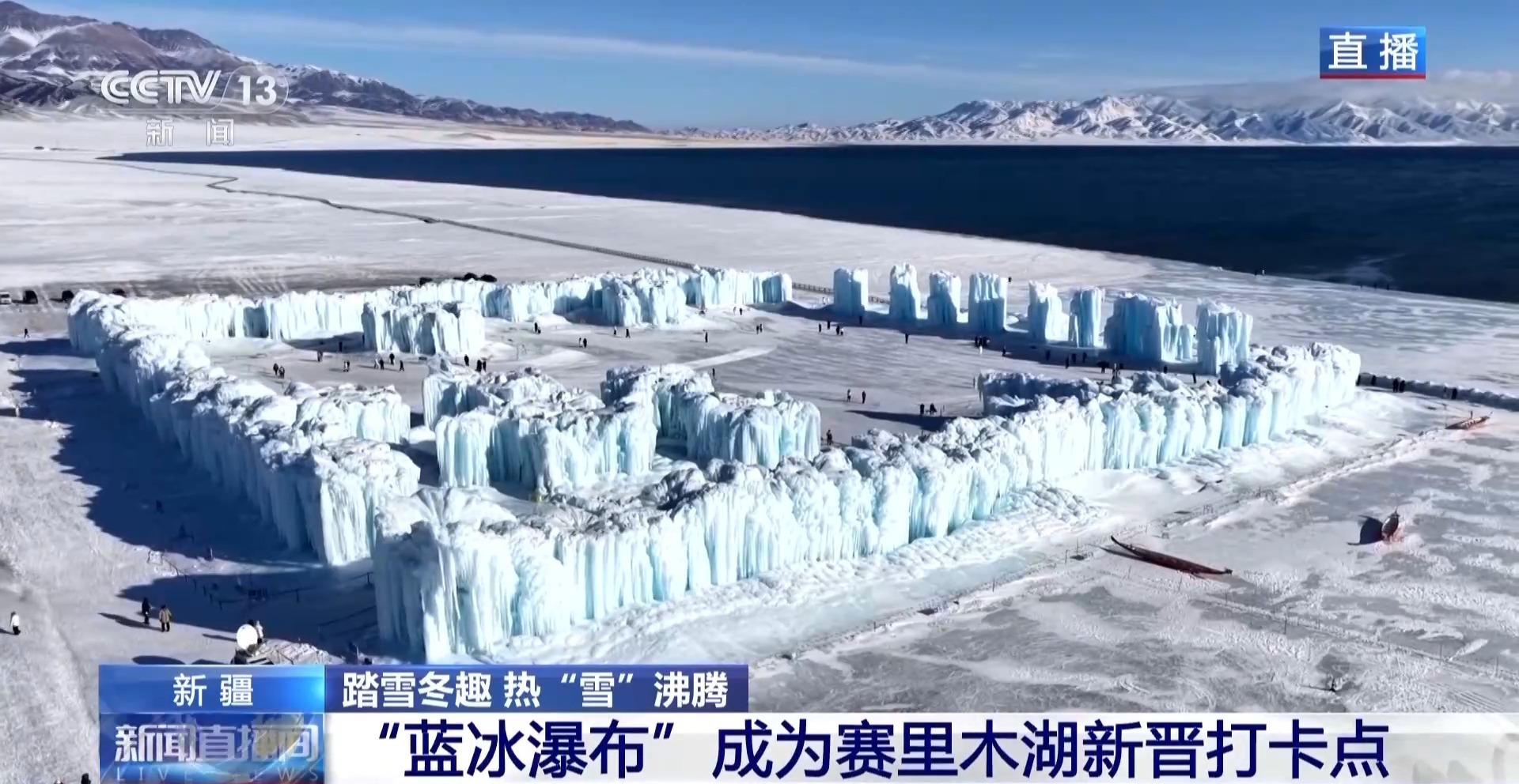 总台记者 苏蒙:我正置身于一片蓝冰瀑布之中,这里就是赛里木湖景区在这个冬季为游客全新升级打造的蓝冰瀑布景观群。