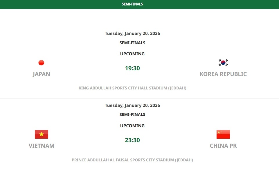 中国队与越南队的半决赛对决将于1月20日23时30分打响。