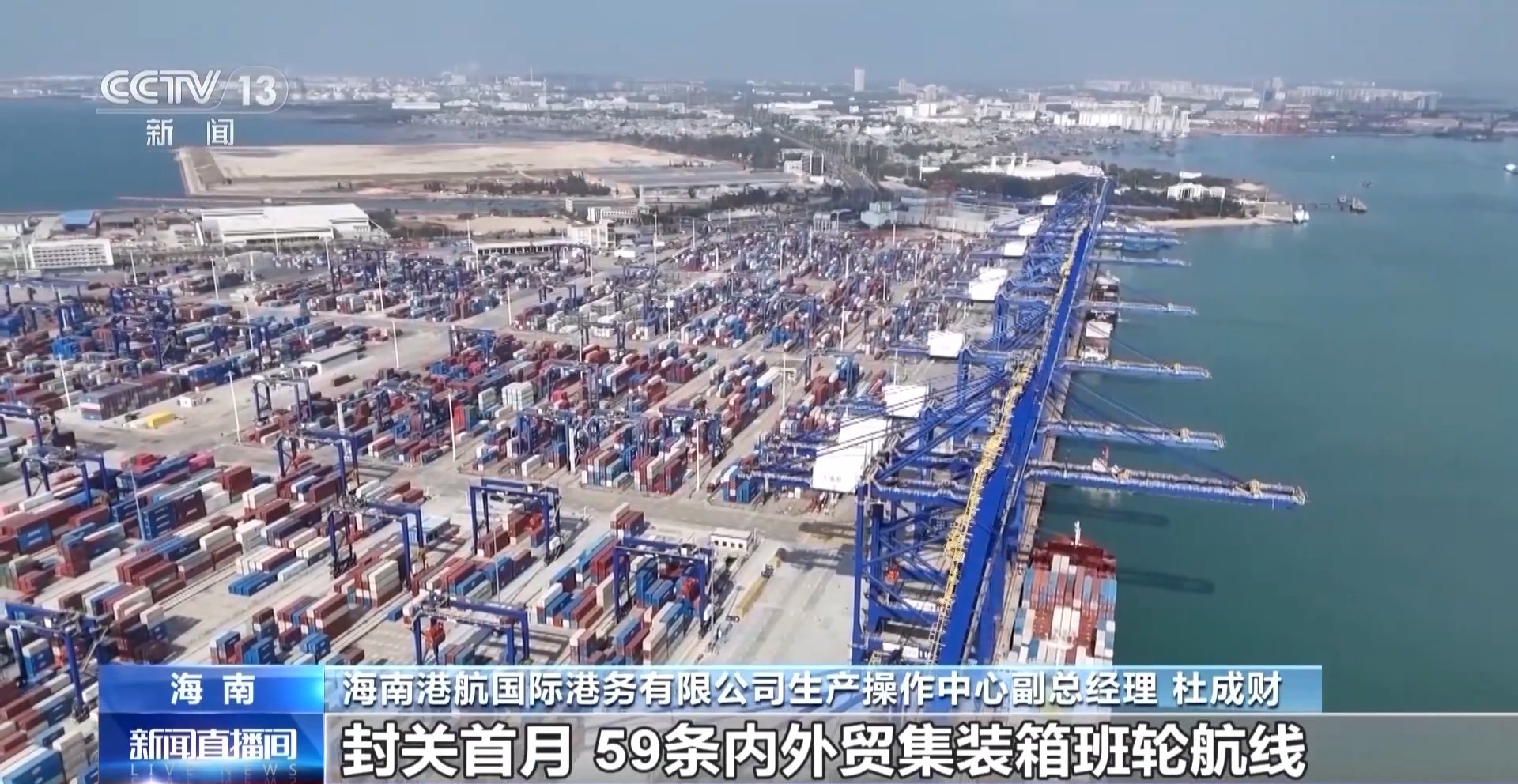 海南港航国际港务有限公司生产操作中心副总经理 杜成财:封关首月,59条内外贸集装箱班轮航线,实现高效运转。整个港口吞吐量持续增长,港口后续将进一步拓展航线网络,在吞吐量上取得新的突破。