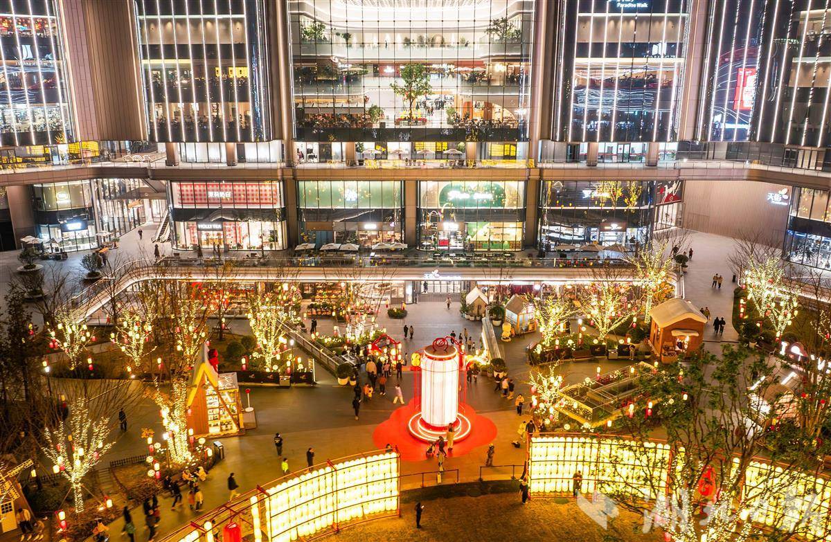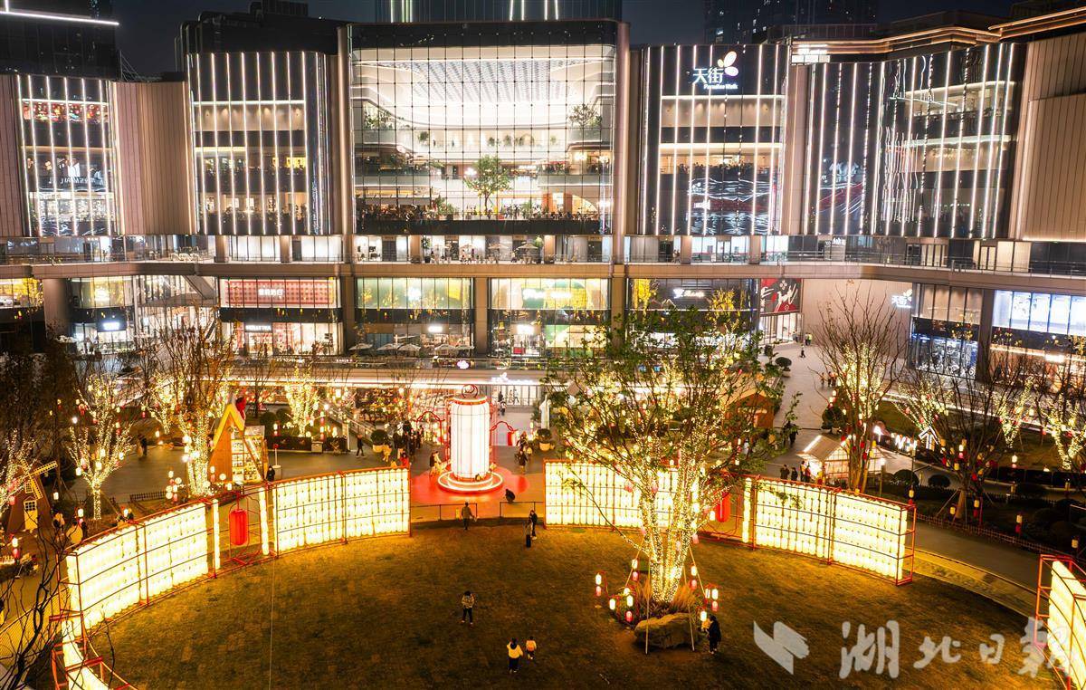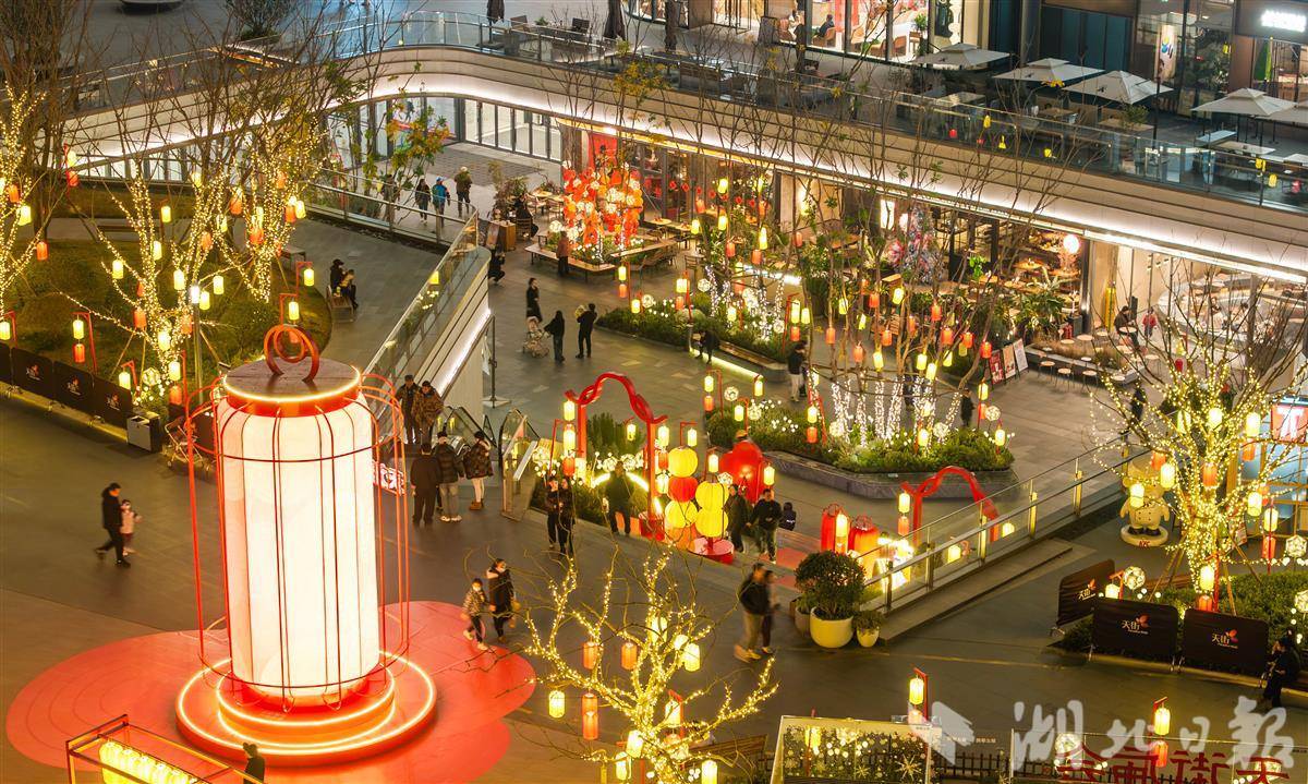 1月18日,武汉滨江天街共享公园彩灯璀璨、流光溢彩。正在此举办的武汉新春庙会,将传统年俗融入现代商圈,以 “灯会 + 花市” 创新打造消费新场景,既营造出浓郁喜庆的氛围,又有效激活消费市场活力,吸引众多市民游客驻足打卡、乐享其中。(湖北日报全媒记者 薛婷 摄)