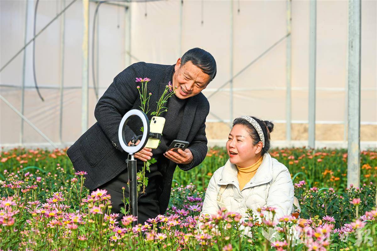1月15日,在黄冈市浠水县清泉镇闫河村湖北锦润生态农业有限公司鲜花种植基地大棚内,返乡创业能人在直播销售鲜花。近年来,浠水县实施乡村产业振兴“能人”项目,通过优化创业环境、定制扶持政策、搭建三级培训体系等举措,支持“新农人”返乡创业,让“新农人”成为乡村振兴核心驱动力。(视界网 王江 摄)