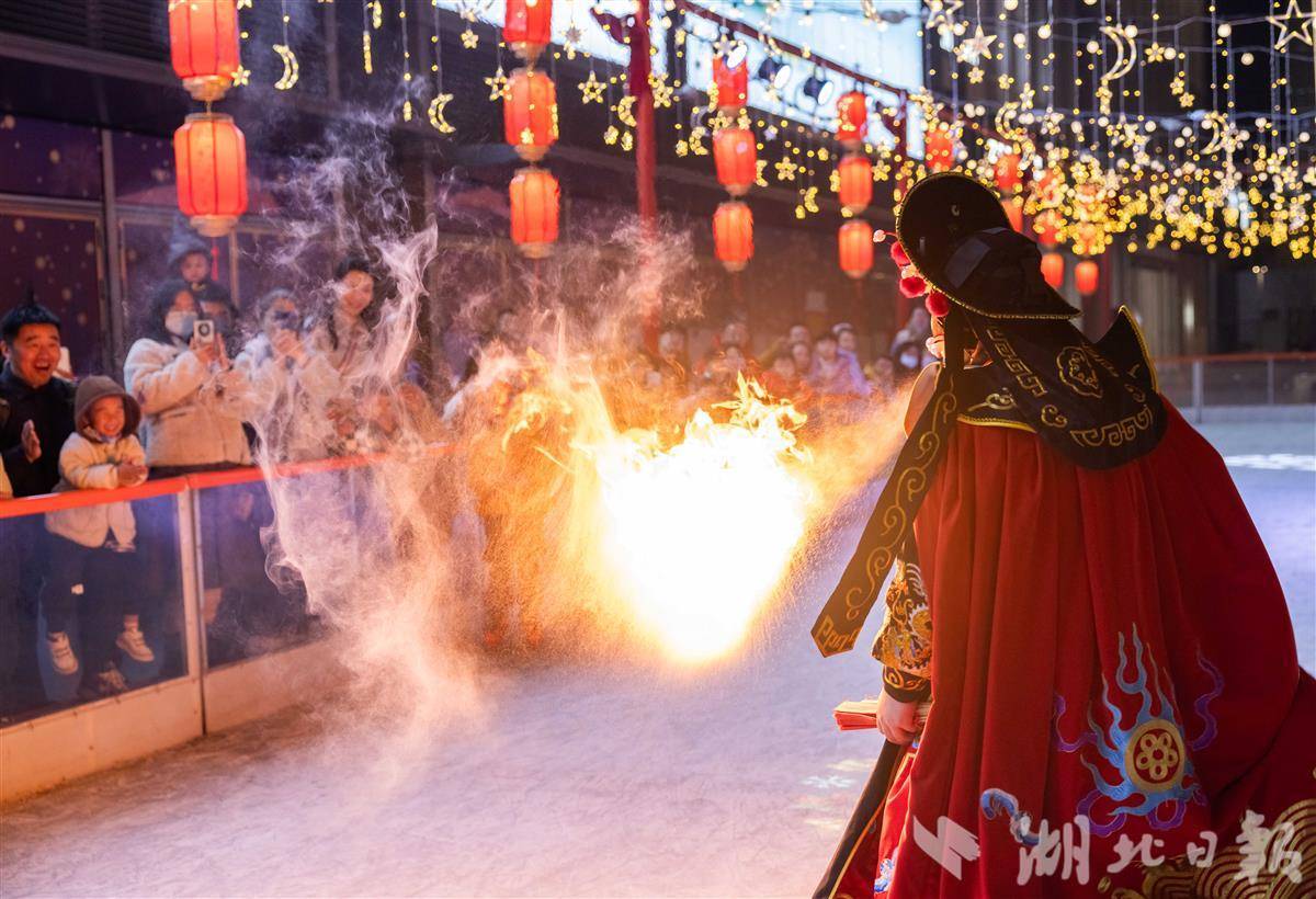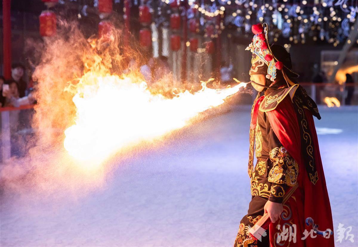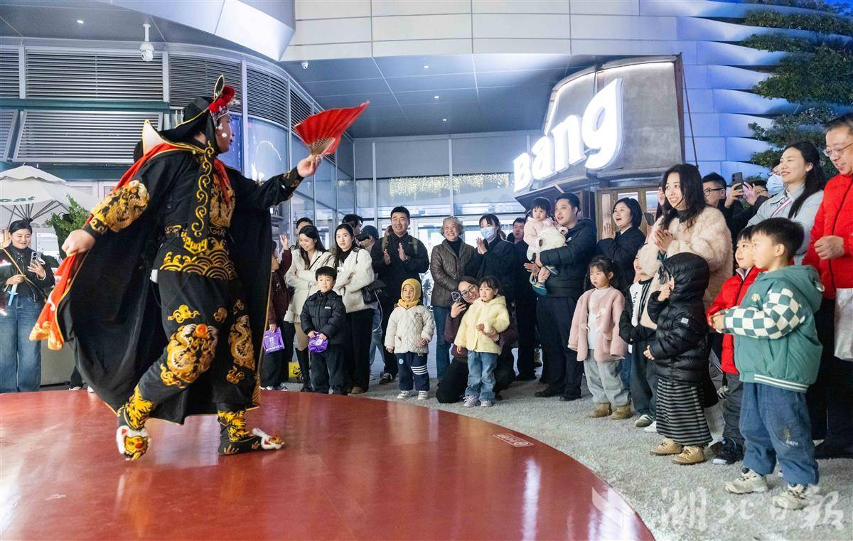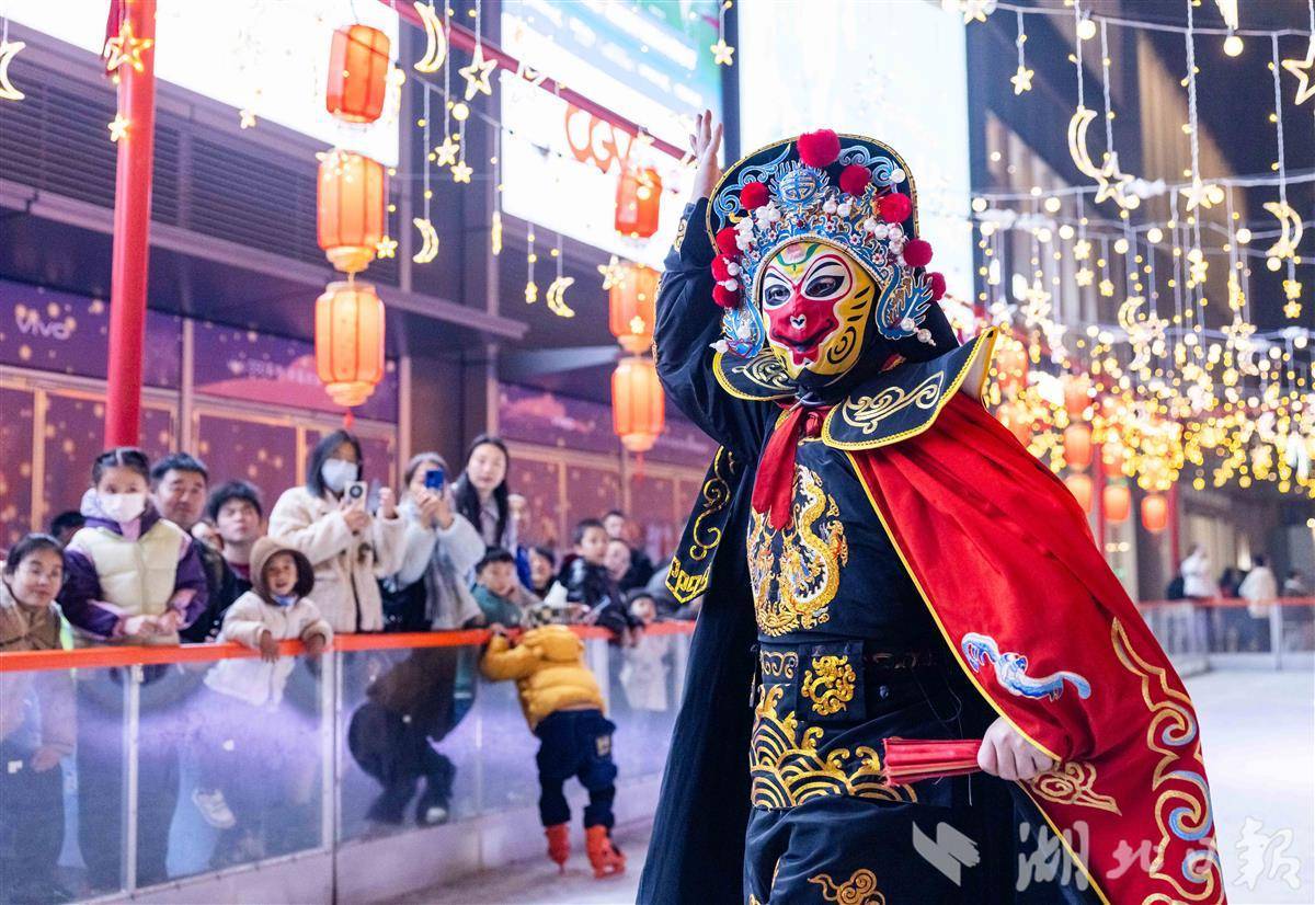 1月17日晚,武汉万象城,非遗传承人在表演川剧变脸,吸引市民游客观看。