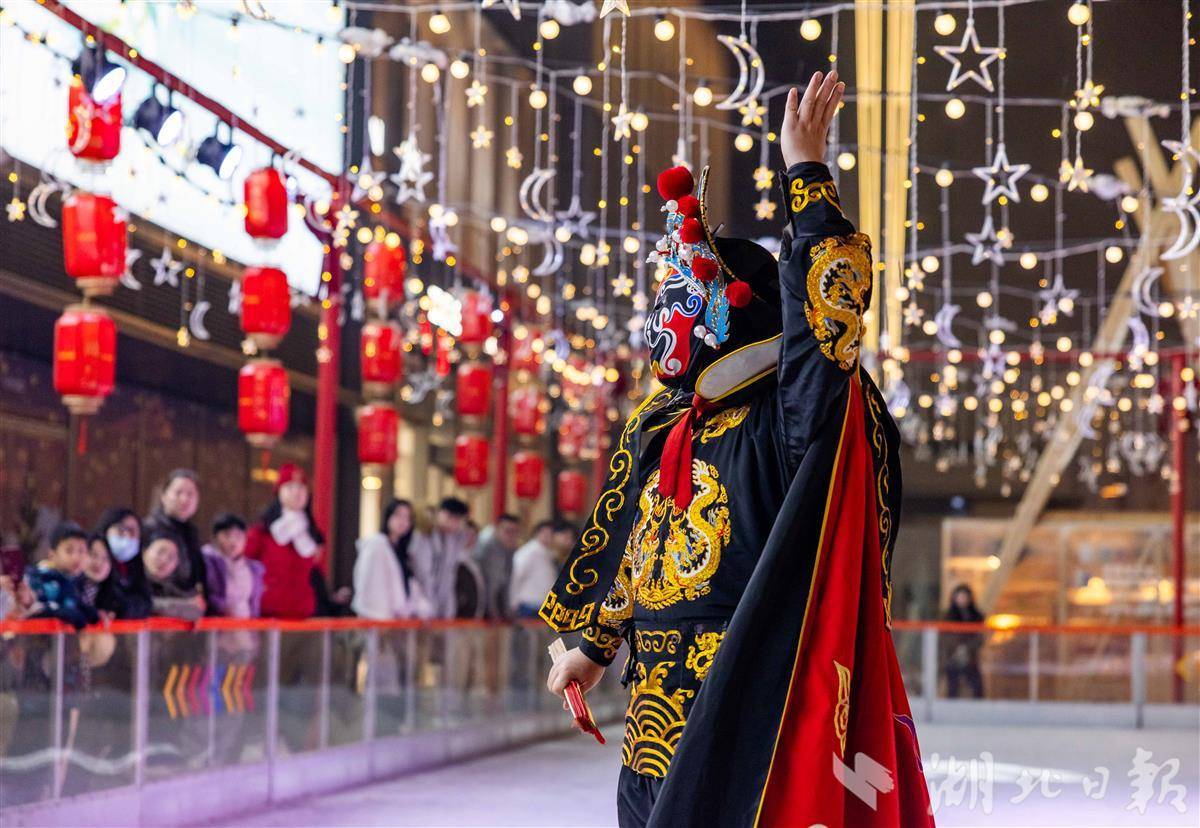 1月17日晚,武汉万象城内,川剧变脸演员脸戴谱面,穿行于时尚商铺之间,吸引市民驻足观看体验。传统非遗走出戏台,融入现代商业空间,通过可触、可互动、可打卡的体验,变身市民身边的“消费搭子”,在跨界融合中激活消费新场景。(湖北日报全媒记者 薛婷 摄)