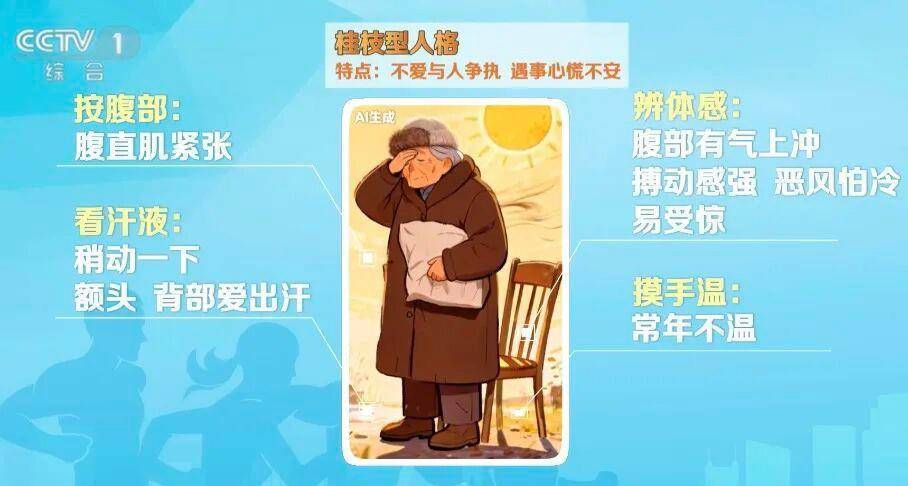 桂枝型人格的特点为不爱与人争执、遇事心慌不安,可通过按腹部、看汗液、辨体感、摸手温来判断自己是否为桂枝型人格。