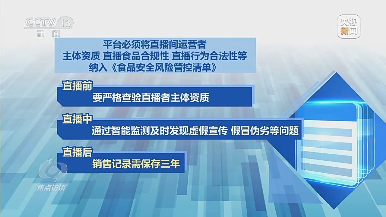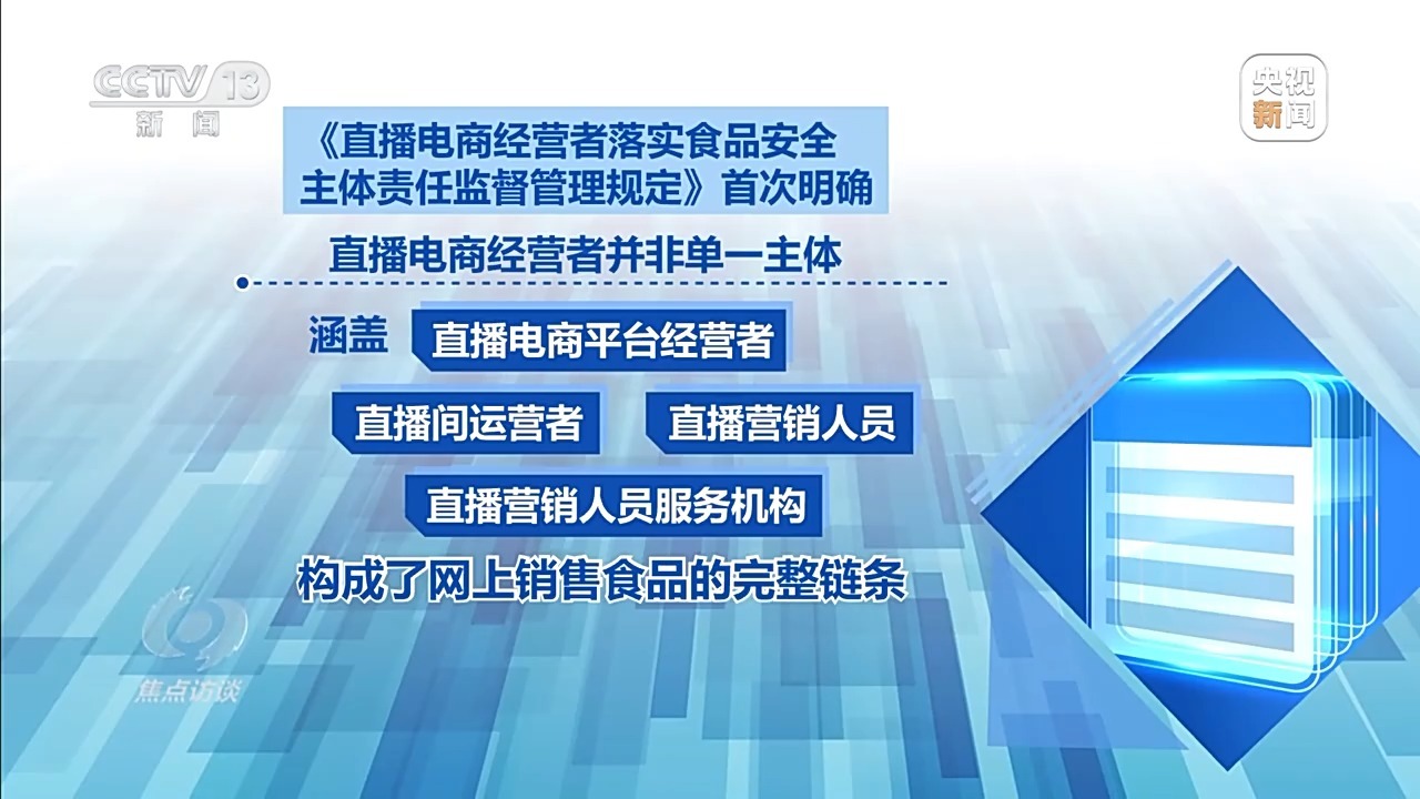 国家市场监管总局法律顾问 毛伟旗:从现在一些翻车的直播达人情况来看,他在落实食品安全主体责任方面有所欠缺。主要表现在直播之前对自己售卖的产品没有做到心中有数,对自己所代言的产品或者所销售的产品性质、成分、功能没有清晰的认识,没有履行食品安全主体责任,没有查验所销售商品的出厂合格证明文件。这一次新的规定里面明确要求,在直播之前要履行进货查验义务,要有报告义务,在直播过程中不得作虚假宣传。