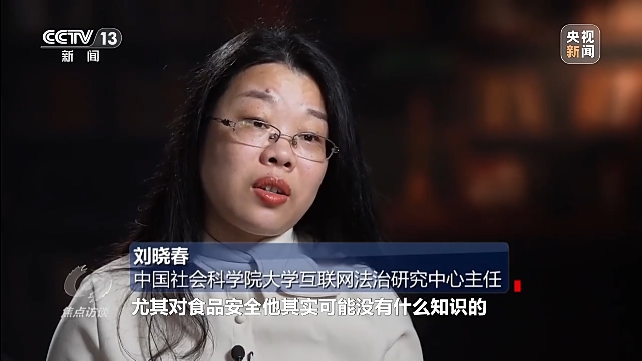 中国社会科学院大学互联网法治研究中心主任 刘晓春:直播尽头是带货,火了之后大家都想去带货。但其实他不是专业的销售者,尤其对食品安全可能没有什么知识。所以现在需要给他们一系列义务,就是你虽然是外行,也要变得更加专业,要去接受培训,或者去寻找专业机构来做一系列合规的审查。因为食品安全绝对不是小事,每一个都是大事,要在源头上做好防控。