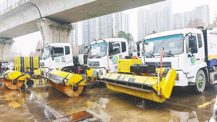 武汉城管环卫部门迎战寒潮,雪滚车、雪铲车等大型除雪设备就位。 (湖北日报全媒记者 张竞恒 通讯员 冯夏雪 陈婷 摄)