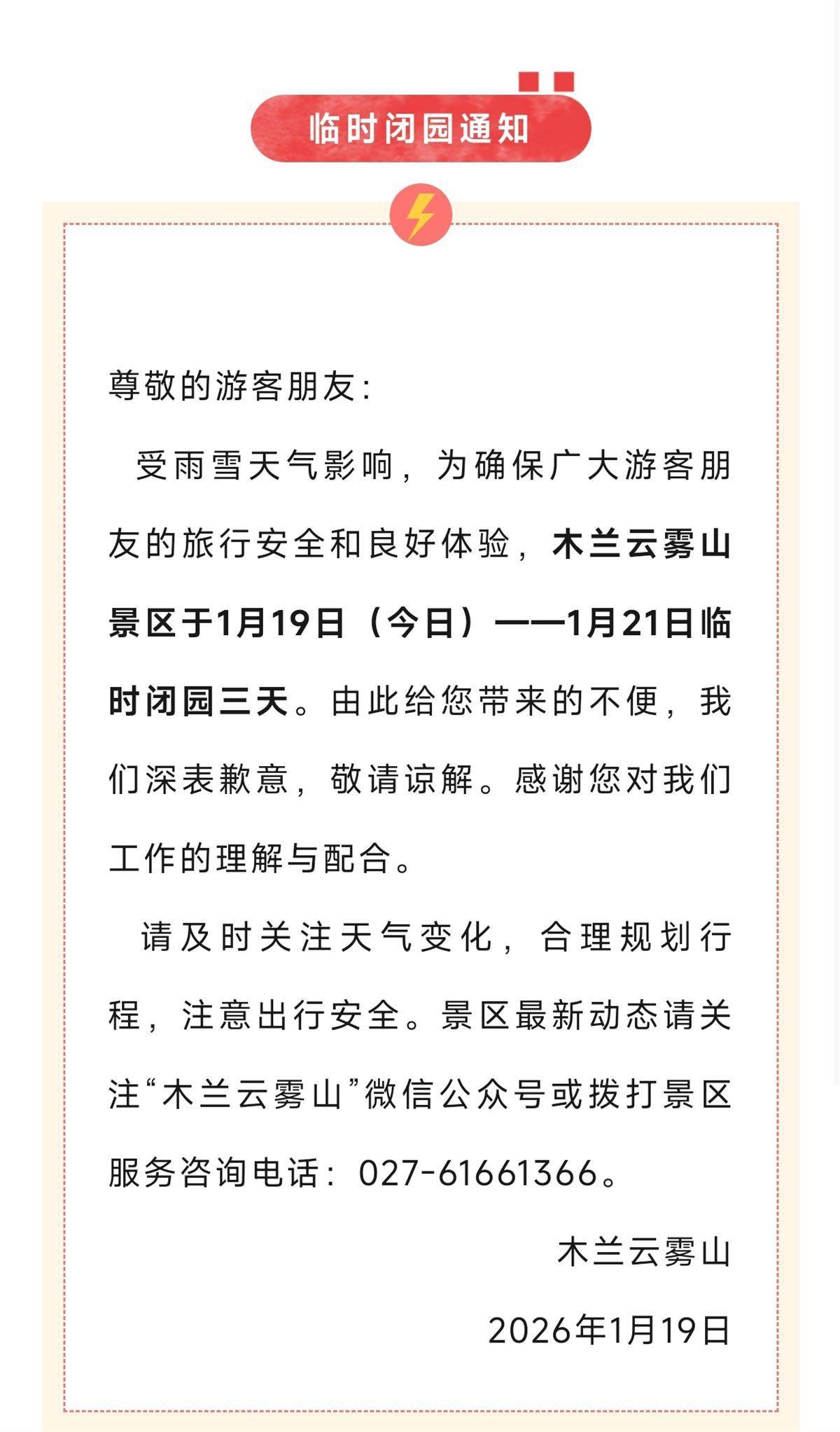 受雨雪天气影响,为确保广大游客朋友的旅行安全和良好体验,木兰云雾山景区于1月19日至1月21日临时闭园三天。由此给您带来的不便,我们深表歉意,敬请谅解。感谢您对我们工作的理解与配合。