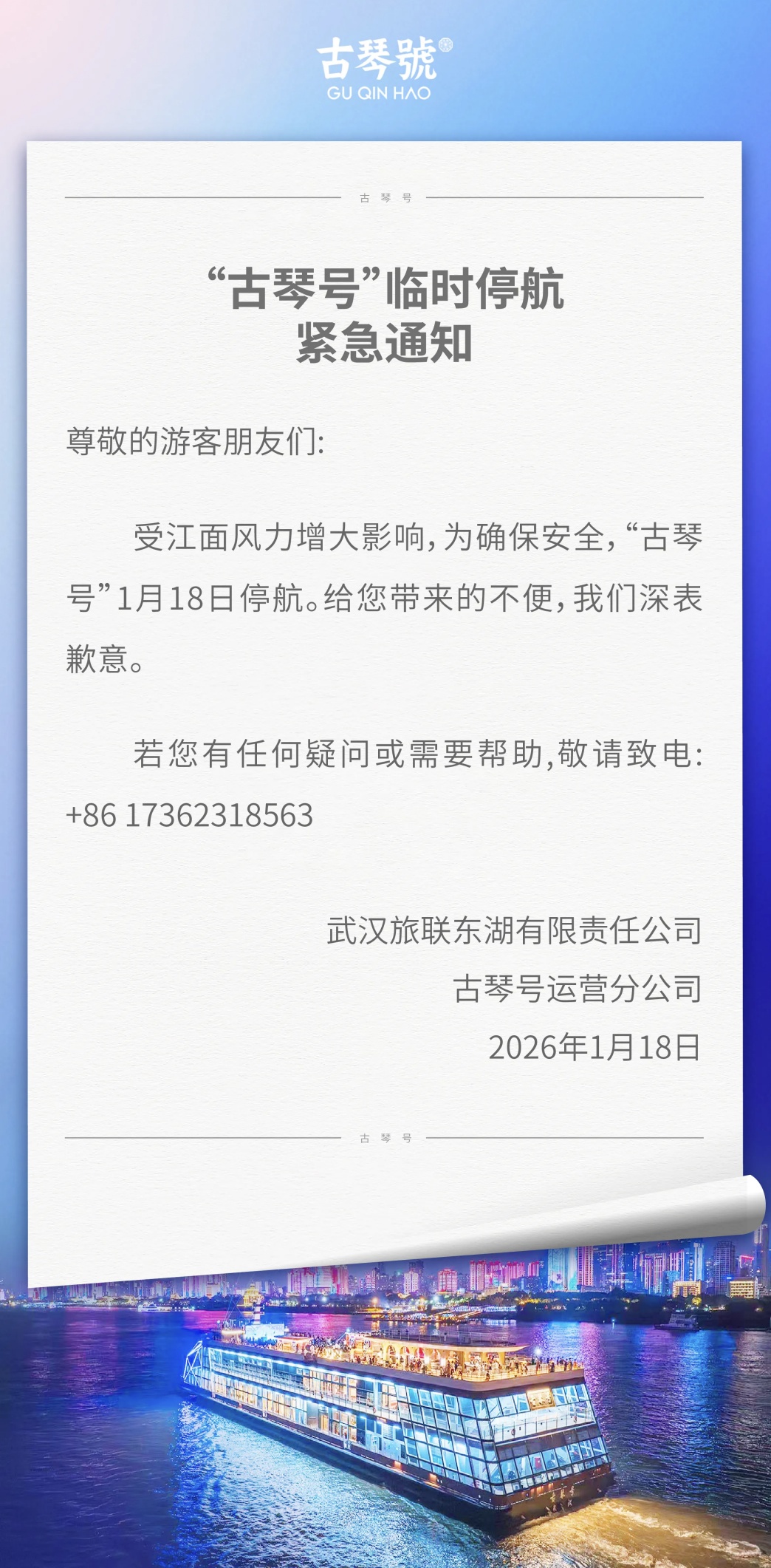 受江面风力增大影响,为确保安全,“古琴号”于1月18日停航。给您带来的不便,我们深表歉意。