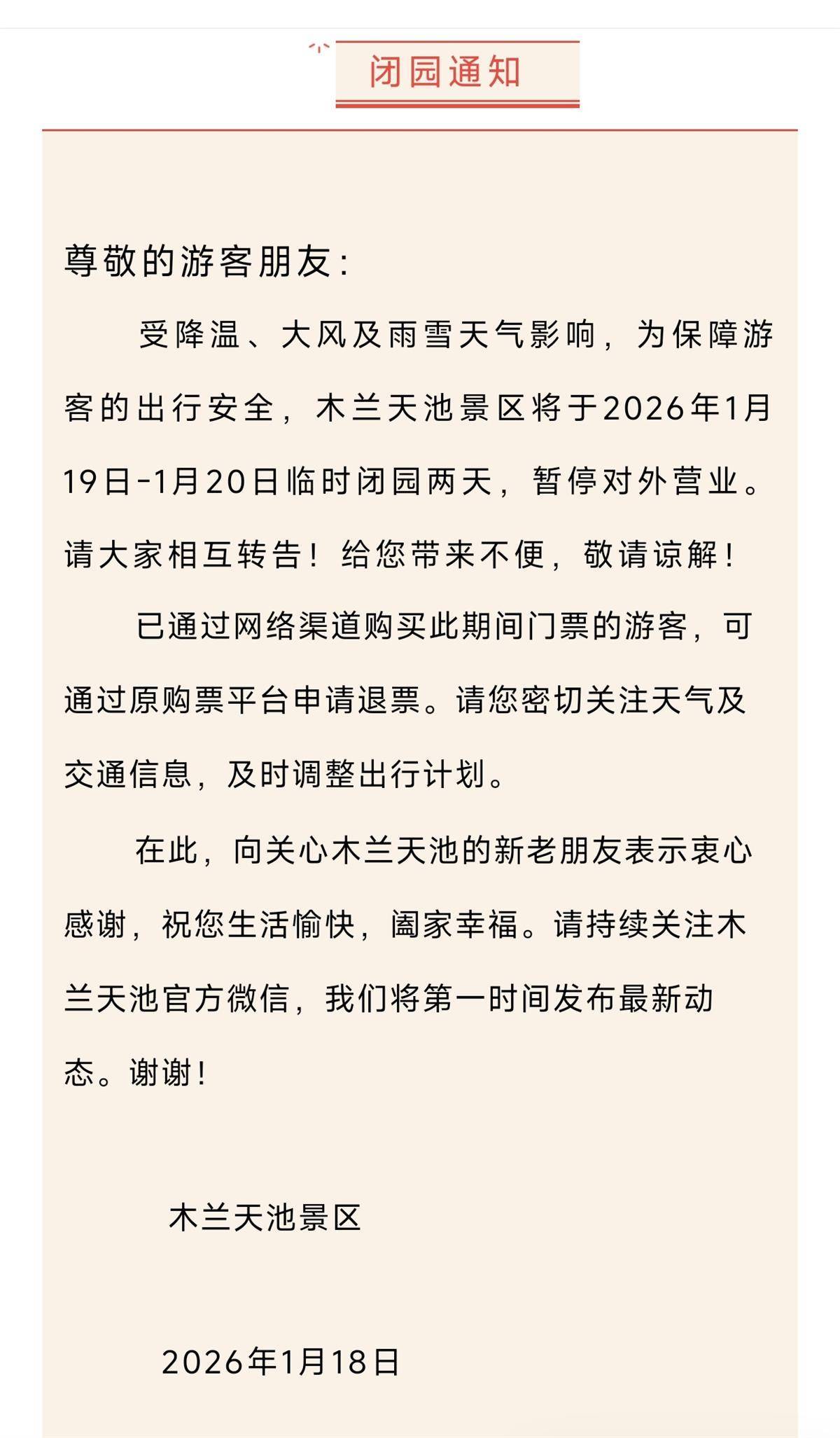 受降温、大风及雨雪天气影响,为保障游客的出行安全,木兰天池景区将于2026年1月19日-1月20日临时闭园两天,暂停对外营业。请大家相互转告!给您带来不便,敬请谅解!已通过网络渠道购买此期间门票的游客,可通过原购票平台申请退票。