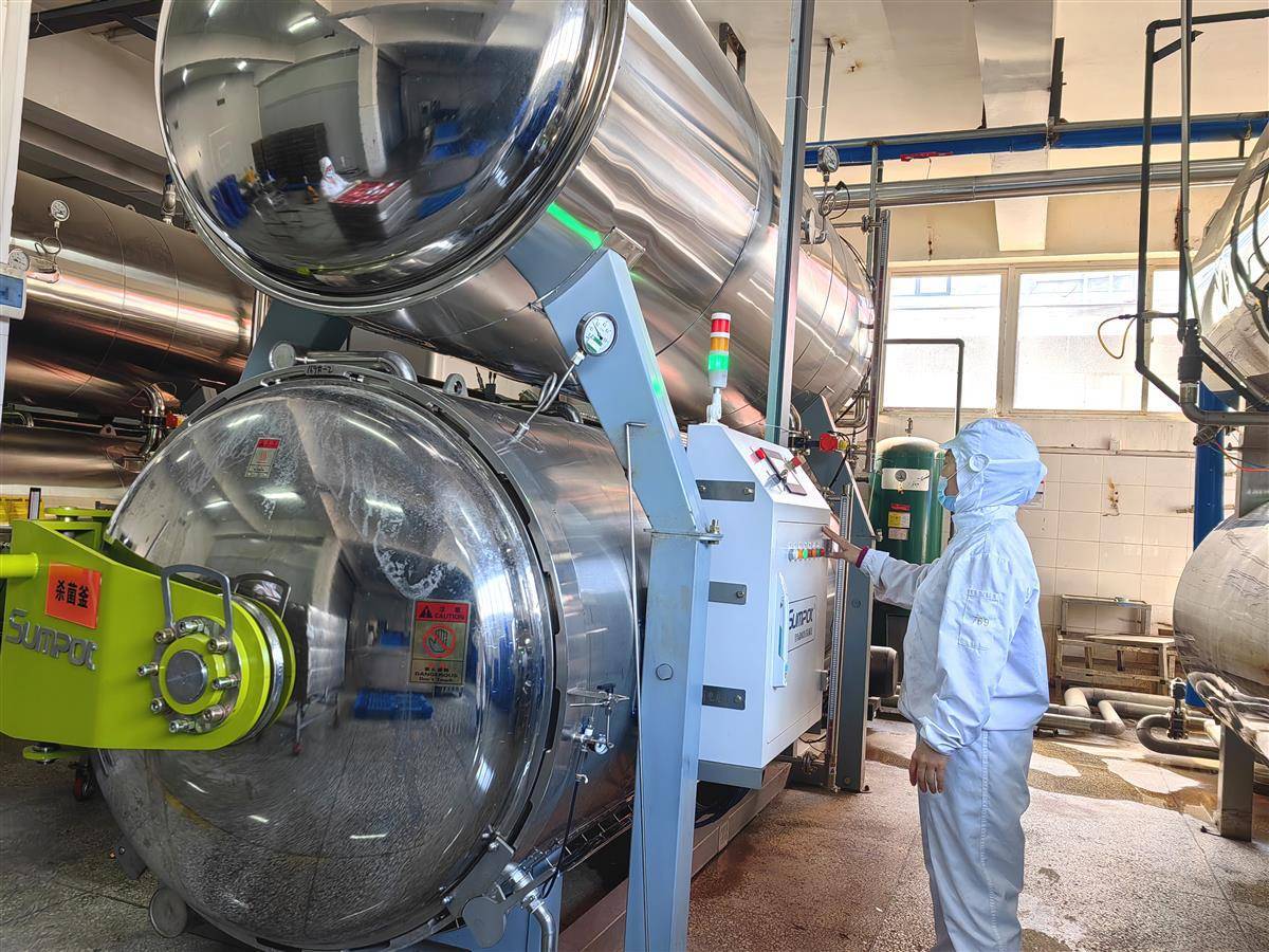 妞妞食品工人正在对八宝饭进行水浴高温消杀。(湖北日报全媒记者 张慧华 摄)
