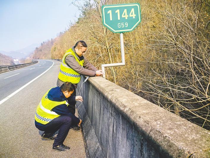 1月17日,湖北交投鄂西北运营公司工作人员正在高速公路上布设远程温湿度监测设备。 (湖北日报通讯员 金伟忠 周俊丽 摄)