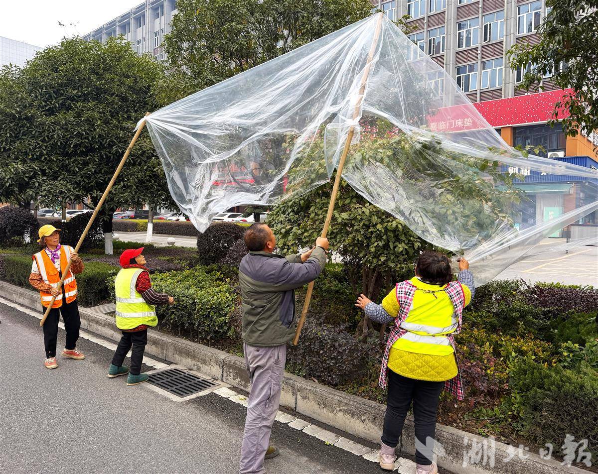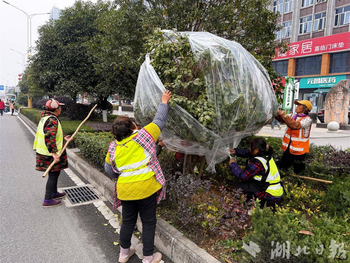 据了解,此次防寒作业覆盖恩施城区多条主次干道的绿化景观带,预计在寒潮抵达前完成全部防护工作。园林工人以辛勤劳作,为恩施的冬日街头筑牢绿色防线,确保开春后城市依然绿意盎然。(视界网 张远明 摄)