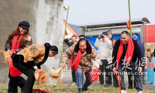 上午10点多,一曲激昂澎湃的《欢聚一堂威风锣鼓》拉开了活动的序幕,铿锵的鼓点瞬间点燃了现场气氛。冷水镇党委相关负责人热情欢迎游子归家,并介绍了家乡一年来的新变化,钟祥邮政公司负责人则送上“人民邮政为人民”的暖心承诺。随后,歌曲《祝福祖国》、独舞《人间烟火》、舞蹈《花开中国》、《福到咱家》等由村民自编自演的节目轮番上演,同步开展的一系列充满乡土气息和年味的趣味活动将现场变成了欢乐的海洋。“估膘”环节,十份新鲜猪肉一字排开,乡亲们凭经验眼力竞猜重量,最接近者喜提猪肉年礼;“谁是真正的领头羊”游戏趣味十足,几位党支部书记同台竞技,在指定区域内徒手抓捕山羊;“鸡不可失”抓鸡游戏更是将气氛推向高潮,抓到“战利品”的村民喜笑颜开。
