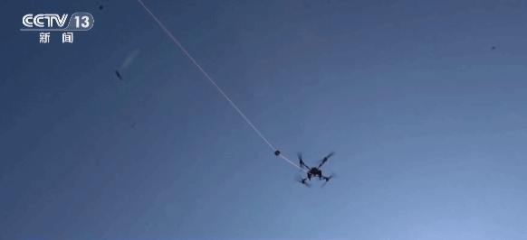 一台无人机带着第一根长2100米、重约8.4千克的高强度、轻量化先导索,从大桥佛渡岛侧桥塔顶端起飞,在复杂海风和海浪的环境下,在空中稳稳飞行了12分钟,将线精准送至六横侧桥塔顶端。不仅节约成本,还精准高效,不影响繁忙的航道。