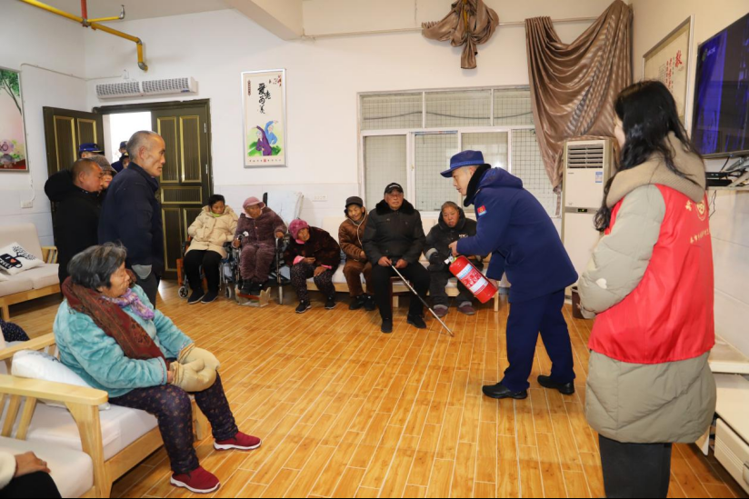 离开独居老人家中,党员队伍前往秦市乡农村福利院,结合冬季火灾特点,用“拉家常”的方式讲解日常生活中的消防安全注意事项,提醒老人不私拉乱接电线、不躺在床上抽烟、正确使用取暖设备,从源头防范火灾事故的发生。“灭火器使用记住‘提、拔、握、压’四字口诀,对准火焰根部喷射。”消防党员拆解操作步骤,反复示范动作要领,确保每位工作人员及老人掌握灭火器使用技巧。活动最后,大队向秦市乡政府捐赠了一批消防应急包和独立烟感报警器,秦市乡政府相关负责人激动地表示:“消防大队的关怀太及时了,这些物资和知识,让我们对老人的安全保障更有底气了!”