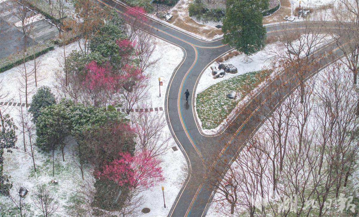 1月19日,在襄阳市襄城檀溪湖公园,市民在雪天出行。