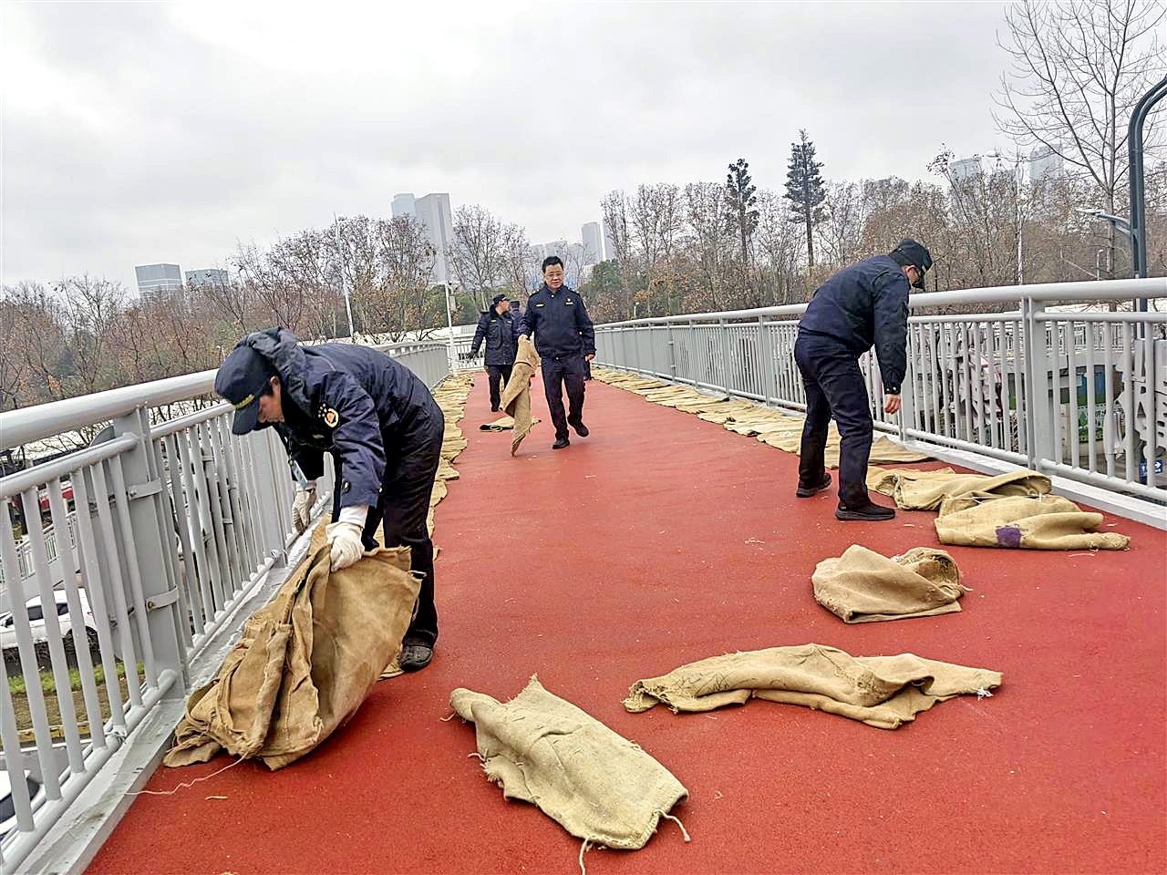 1月19日9时起,武汉启动低温雨雪冰冻灾害Ⅳ级应急响应,该市城管环卫部门在人行天桥、风口处等易结冰路段,铺设防滑草垫和麻袋,保障市民安全出行。从1月18日夜间到19日下午,为应对低温雨雪冰冻灾害,武汉市共出动人员16878人,车辆1750台,机械设备141台,铺设草垫麻袋近2万条。
