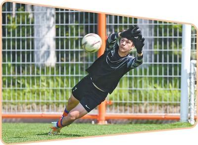 站在门前,周海滨并不着急扑救,他指着场上的人墙板,向队员讲解角球要点。队员轮流上场练习,他紧盯每个人的动作,不时指导:“球的方向是好的,但角度有点低……”