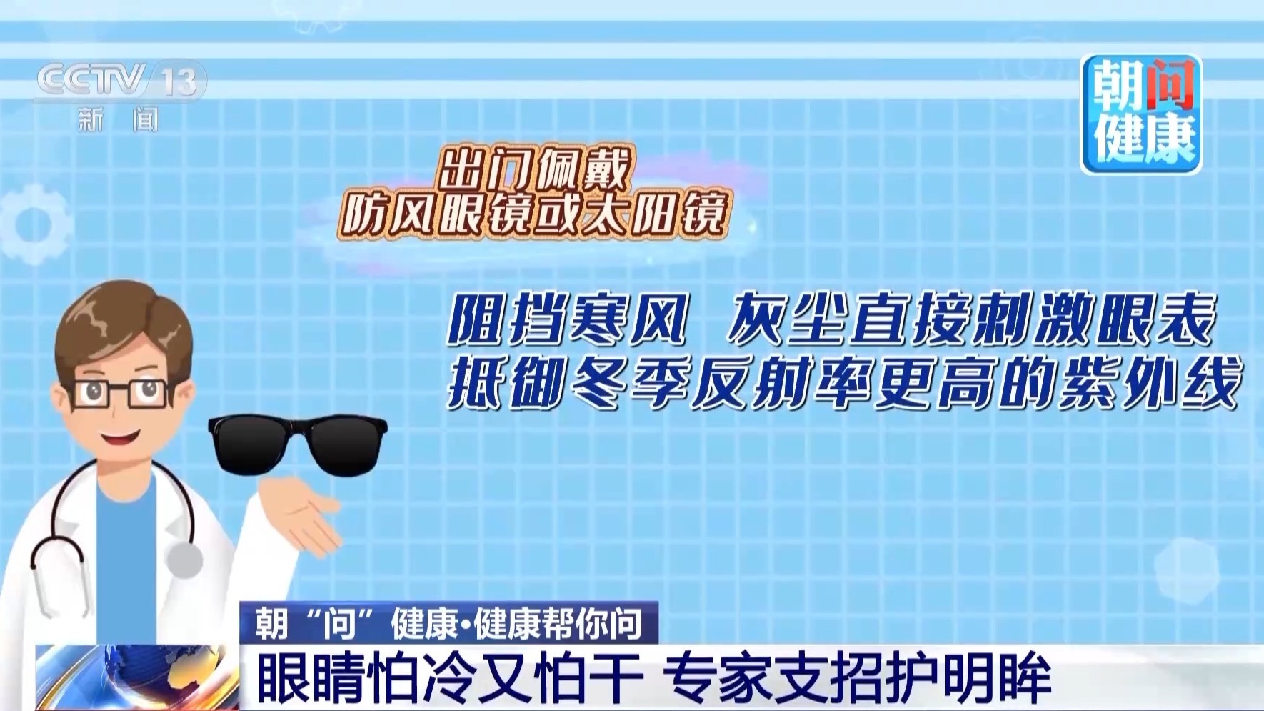 冬季护眼该怎么做?出门佩戴防风眼镜或太阳镜,既能阻挡寒风、灰尘直接刺激眼表,还能抵御冬季反射率更高的紫外线;此外,建议避开低温大风时段外出。