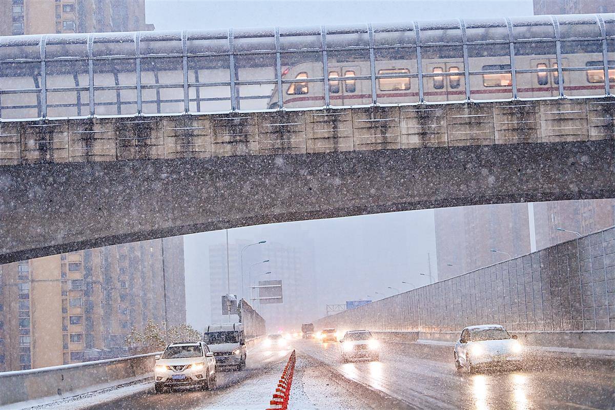 1月20日7时许,大雪中,武汉白沙洲,一列列地铁列车从杨泗港快速通道高架桥上呼啸而过,与桥上行驶的汽车绘就出一幅别样的雪中城市立体交通图。