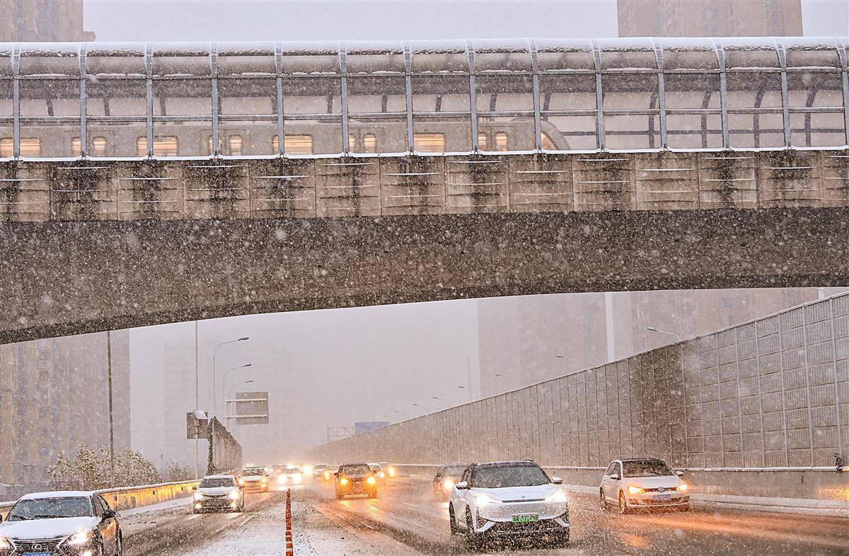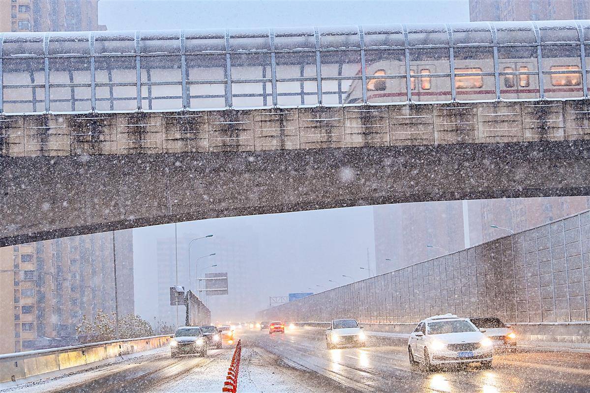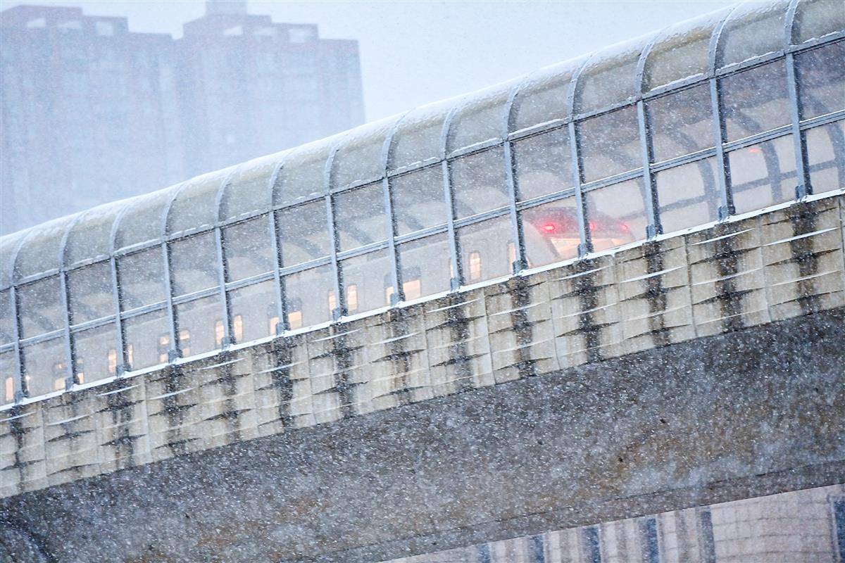1月20日7时许,大雪中,武汉白沙洲,一列列地铁列车从杨泗港快速通道高架桥上呼啸而过,与桥上行驶的汽车绘就出一幅别样的雪中城市立体交通图。此处,杨泗港快速通道青菱段高架桥下穿轨道交通五号线,公路高架和地铁高架均加装了隔音屏,能有效降低汽车和列车发出的噪声,满足两侧居民正常生活的要求。(湖北日报全媒记者 朱熙勇 摄)