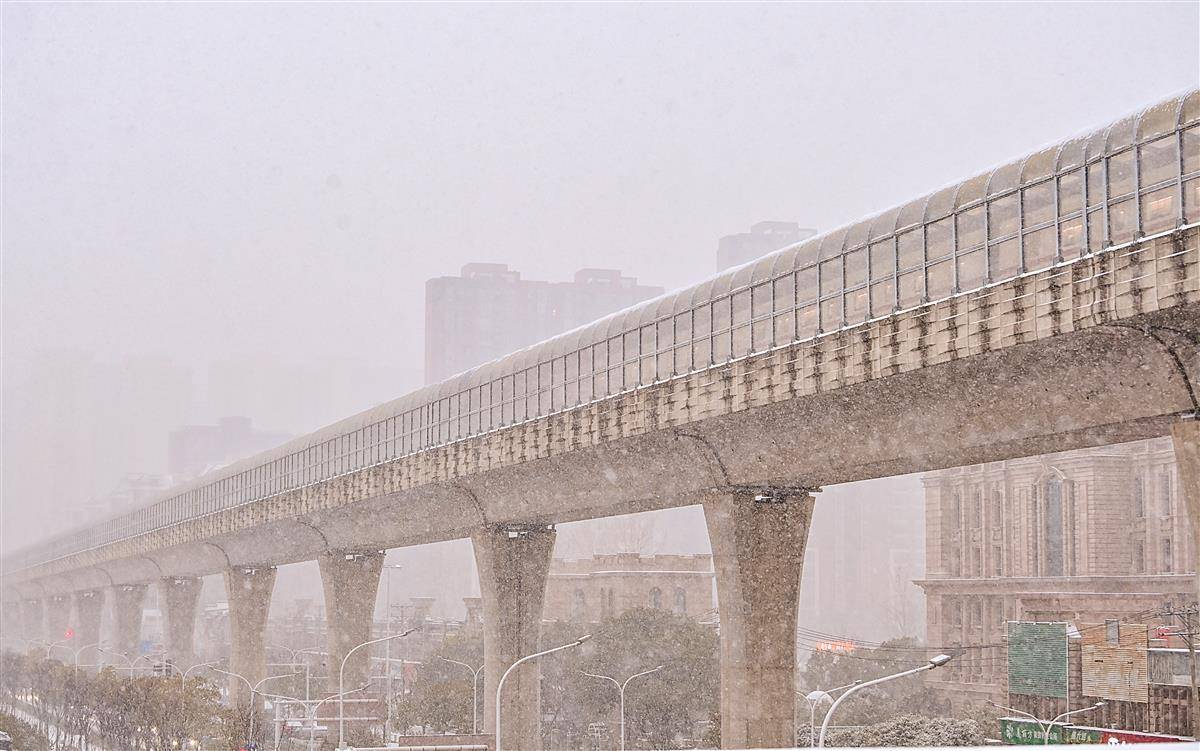 1月20日7时许,大雪中,武汉白沙洲,一列列地铁列车从杨泗港快速通道高架桥上呼啸而过。