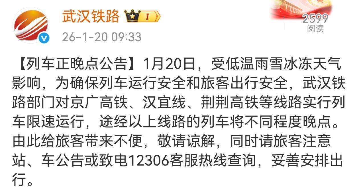 湖北日报讯(记者胡祎)1月20日,中国铁路武汉局集团有限公司官方微博“武汉铁路”发布公告,受低温雨雪冰冻天气影响,为确保列车运行安全和旅客出行安全,对京广高铁、汉宜线、荆荆高铁等线路实行列车限速运行,途经以上线路的列车将不同程度晚点。