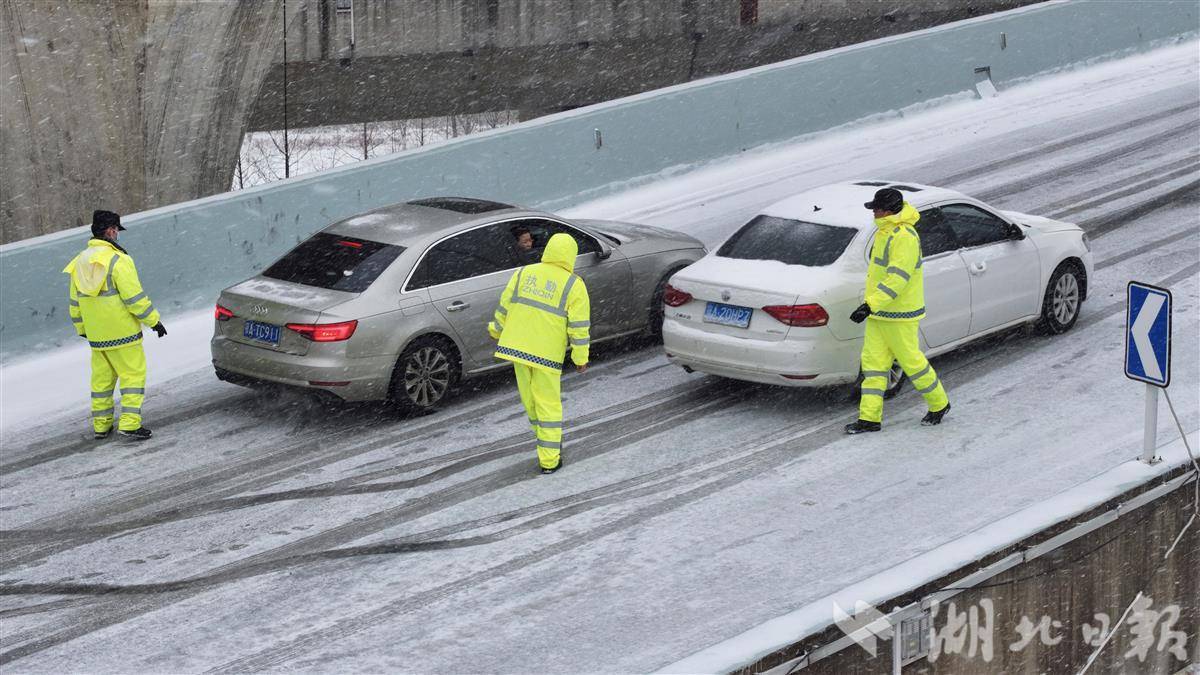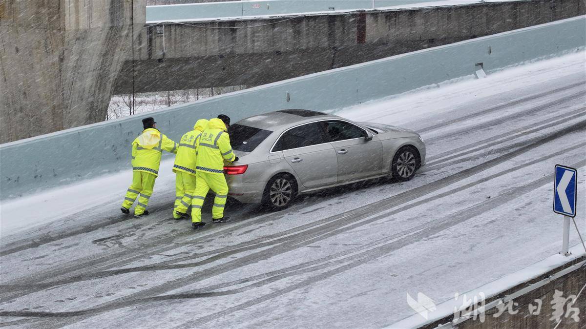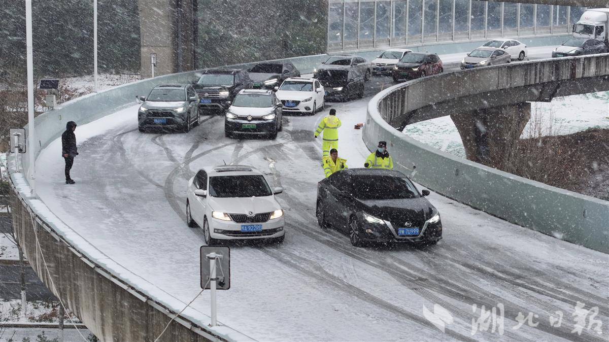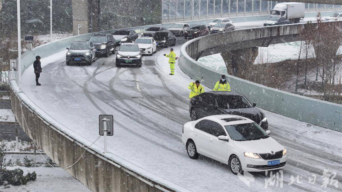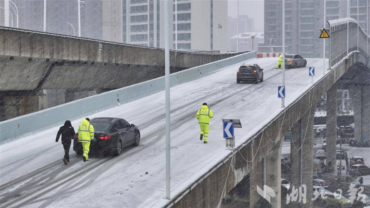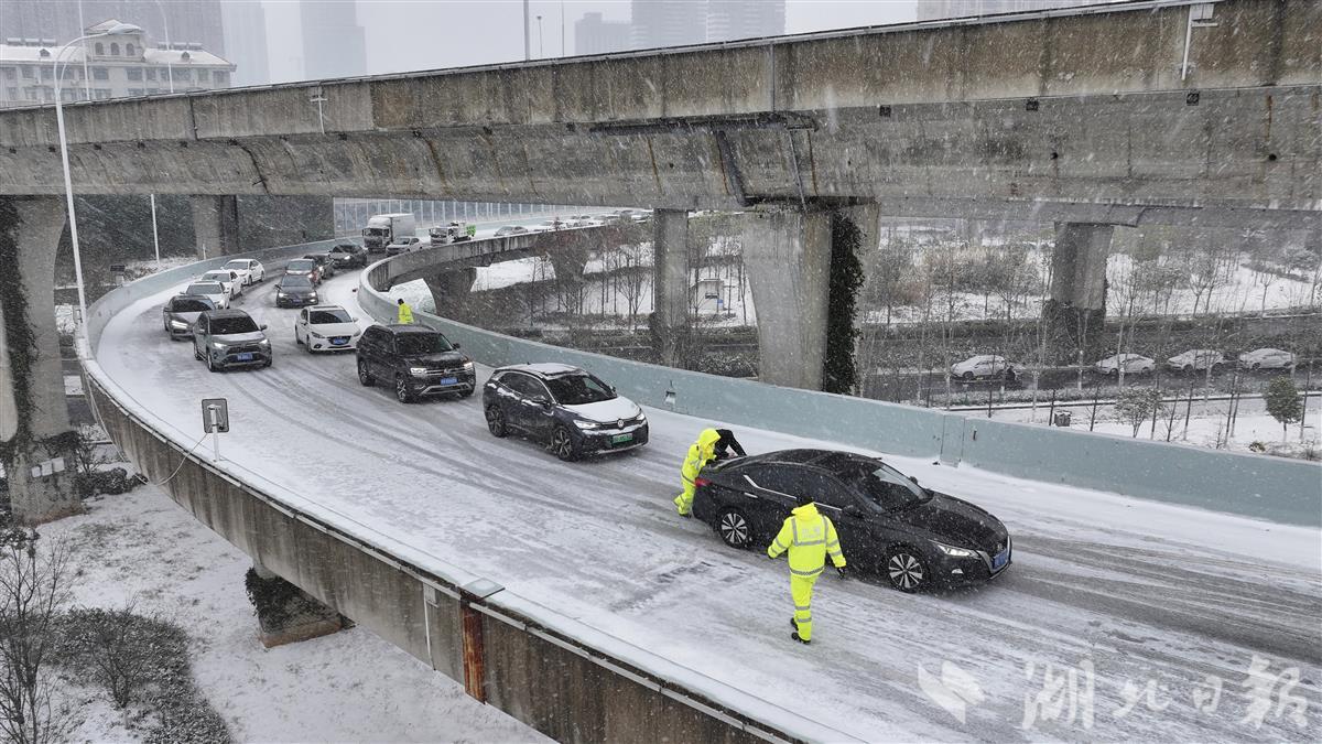1月20日早高峰,受持续降雪影响,武汉二环线鹦鹉洲大桥至雄楚高架匝道上坡路段积雪结冰。武汉交警迅速赶赴现场,帮助车主推车脱困,同时疏导车流、维持秩序,以风雪中的坚守,保障道路通行安全。(湖北日报全媒记者 陈少哲 摄)