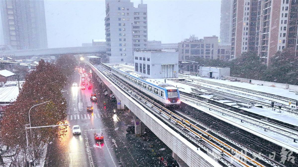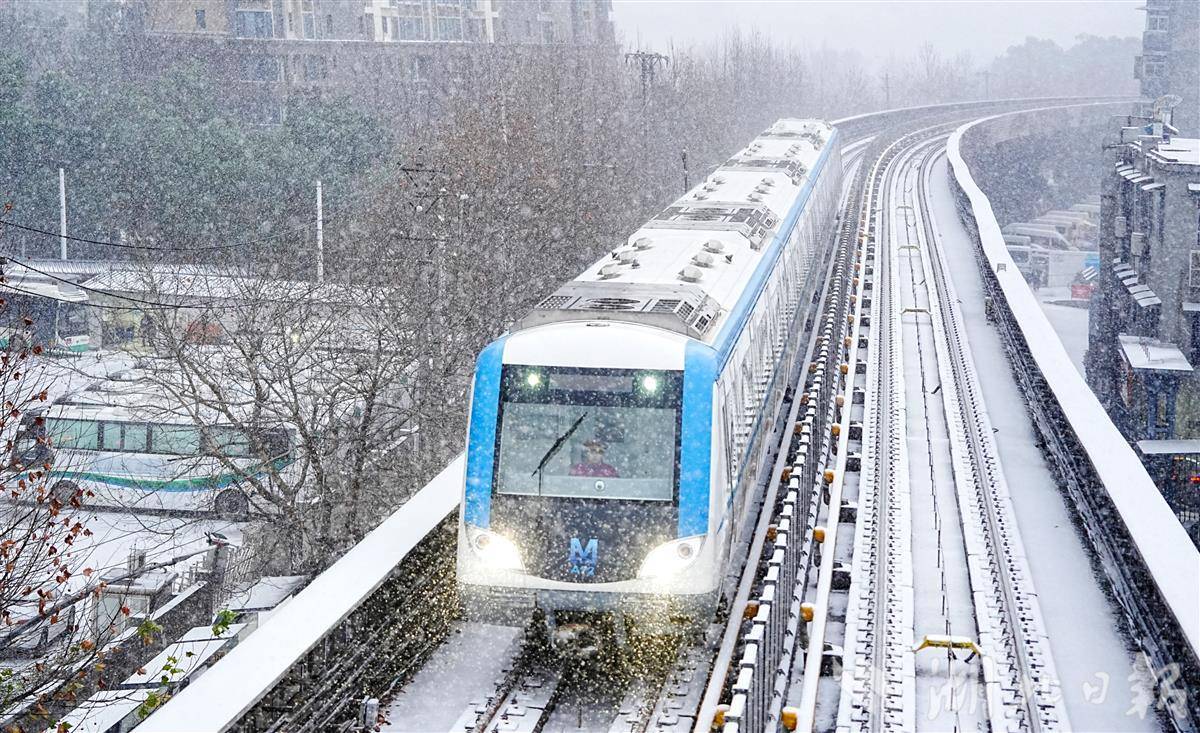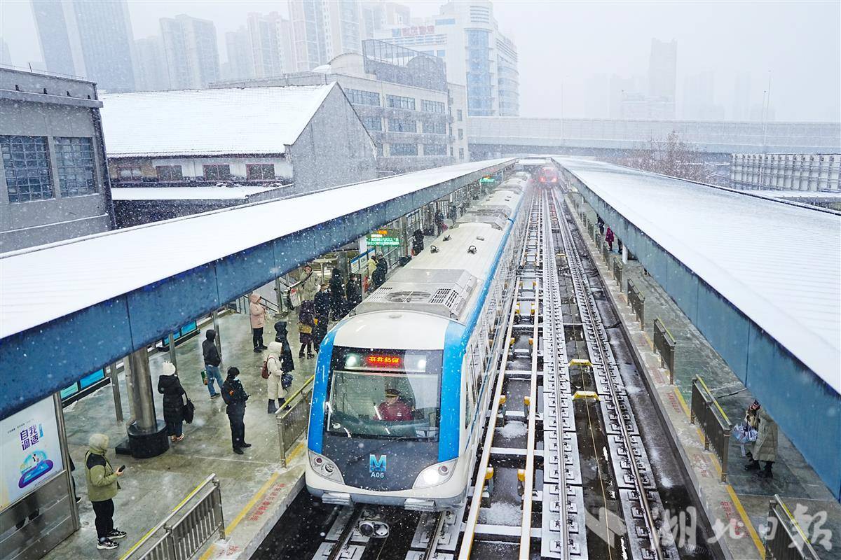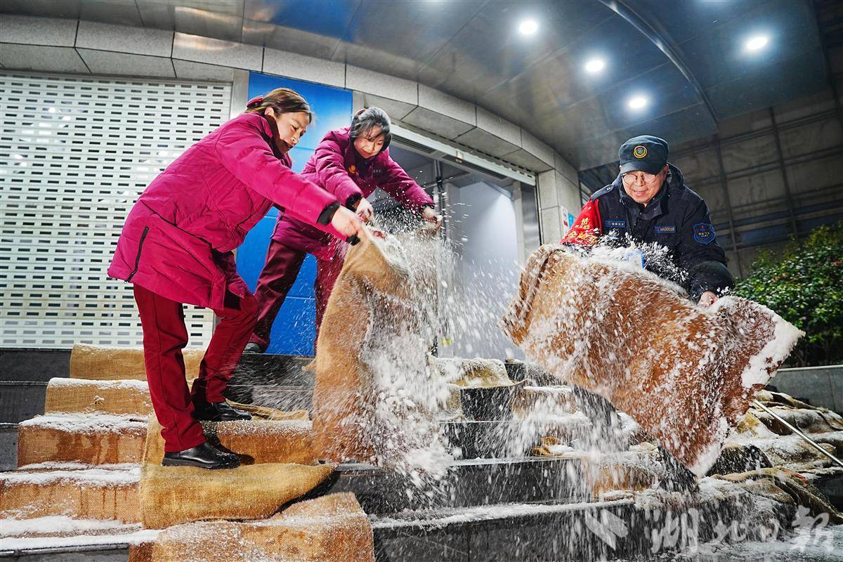 1月19日夜间至20日凌晨,武汉下起大雪,武汉地铁按照低温雨雪冰冻灾害应急响应全力做好运营保障工作,统一调度所有线路提前整备当日运营工作,确保线网6时准时开班运营。4000余名工作人员对线网312座车站的出入口、通道等关键区域开展积雪清扫作业,并及时铺设防滑地垫与麻袋,供电、信号、线路、车辆等专业技术人员值守在重点岗位,切实守护乘客出行安全。(通讯员 李丹 产启斗 摄)