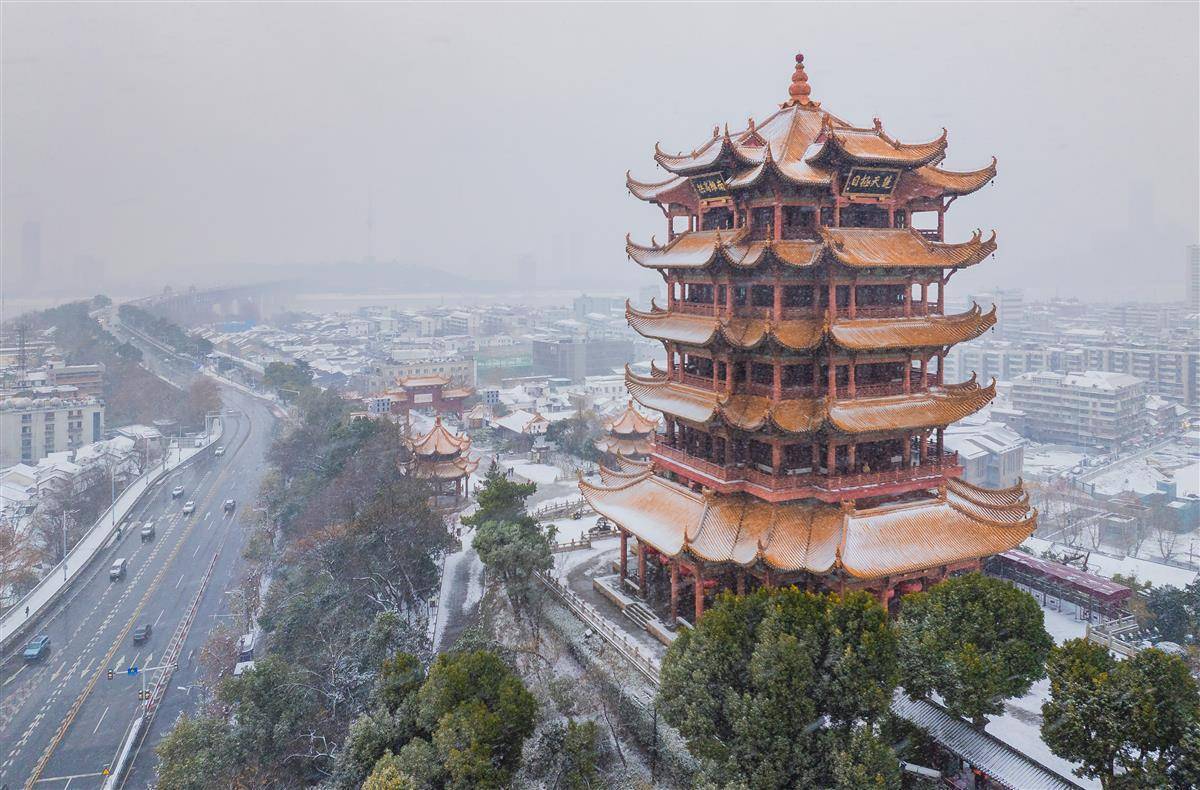 高空俯瞰才懂的浪漫!1 月 20 日武汉飘起鹅毛大雪,千年黄鹤楼身披银装,飞檐翘角落满白雪,古韵与冬雪撞了个满怀。这就是江城独有的冬日诗意!(湖北日报全媒记者 柯皓 摄)