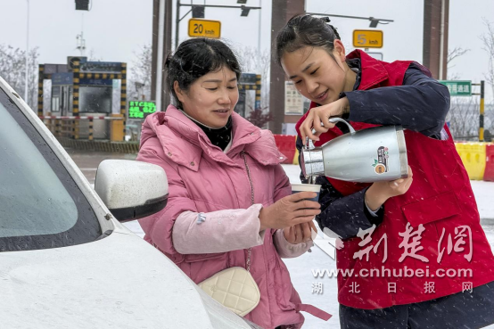 白马寺管理所收费员给司乘送热茶。