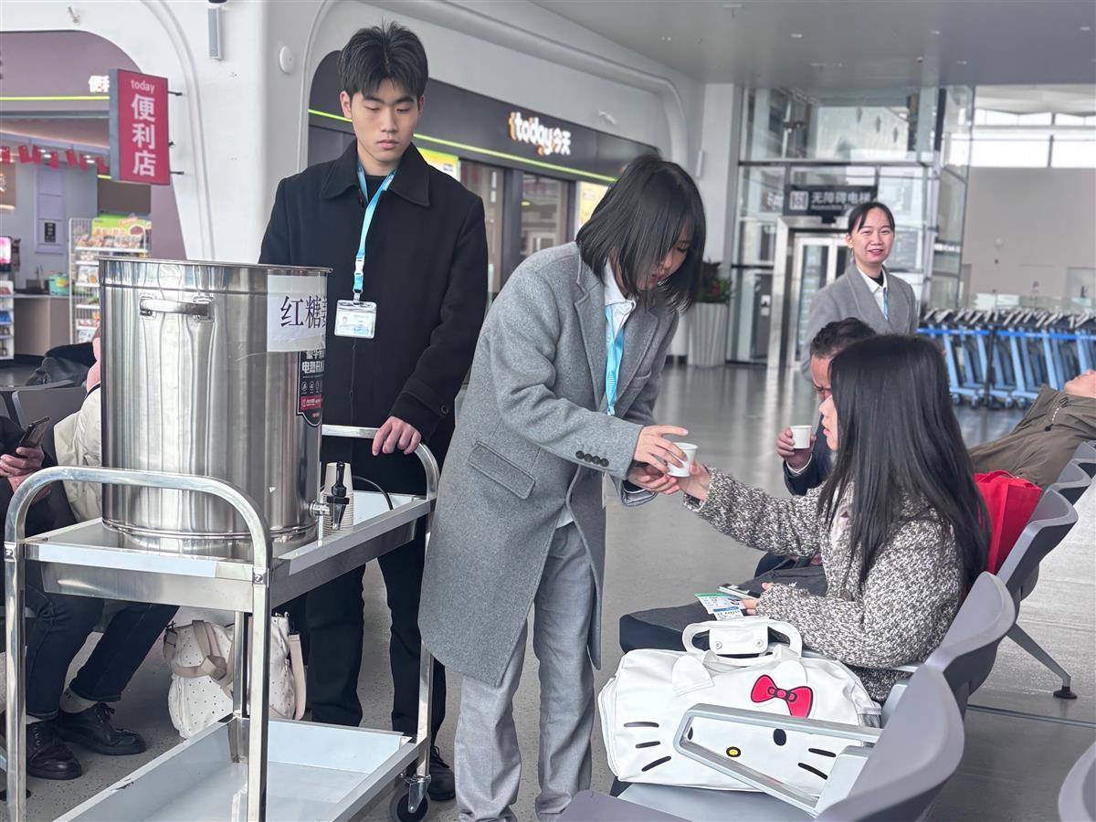 机场工作人员为旅客送上姜茶、红糖水热饮