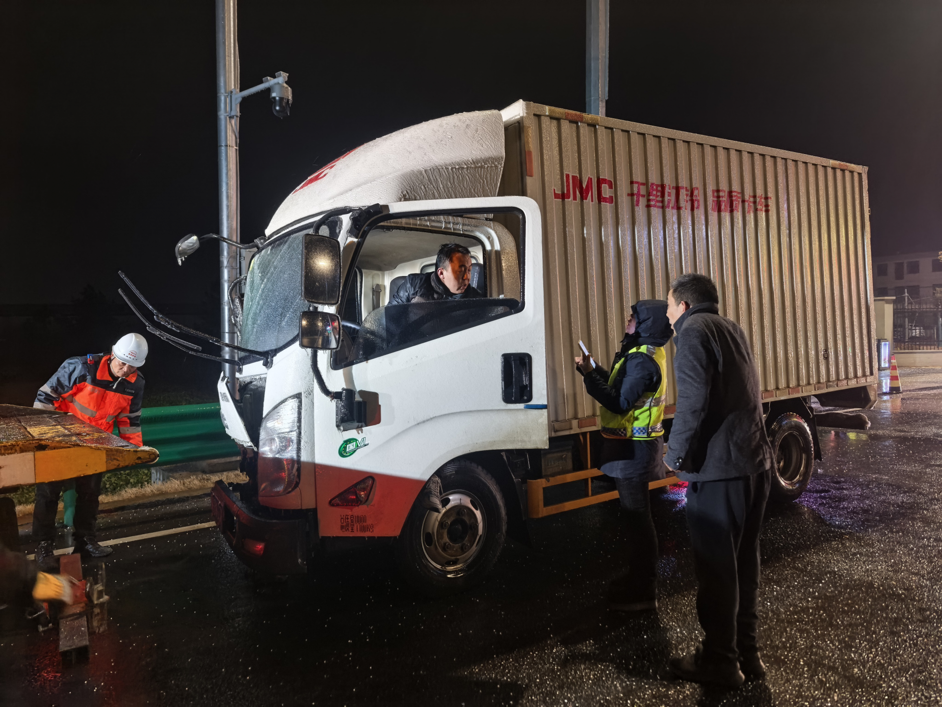 “真是太感谢你们了!大晚上下着雪,我又人生地不熟,没有你们帮忙真不知道该怎么办。”1月19日晚20时许,一辆鄂K籍货车驶离孝感西收费站后突发故障,滞留在出口广场,司机张先生一时手足无措。正在广场巡查的现场管控员小王及时发现异常,立即在车辆后方规范摆放安全警示标志,上前询问情况。