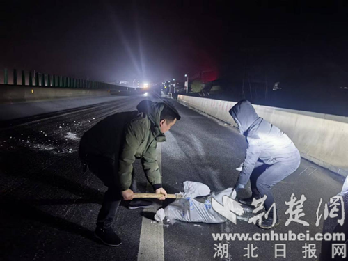 19日深夜 在桥梁抛撒融雪剂。通讯员 供图