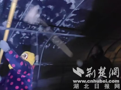 19日深夜,在荆南村果蔬大棚清雪。通讯员 供图