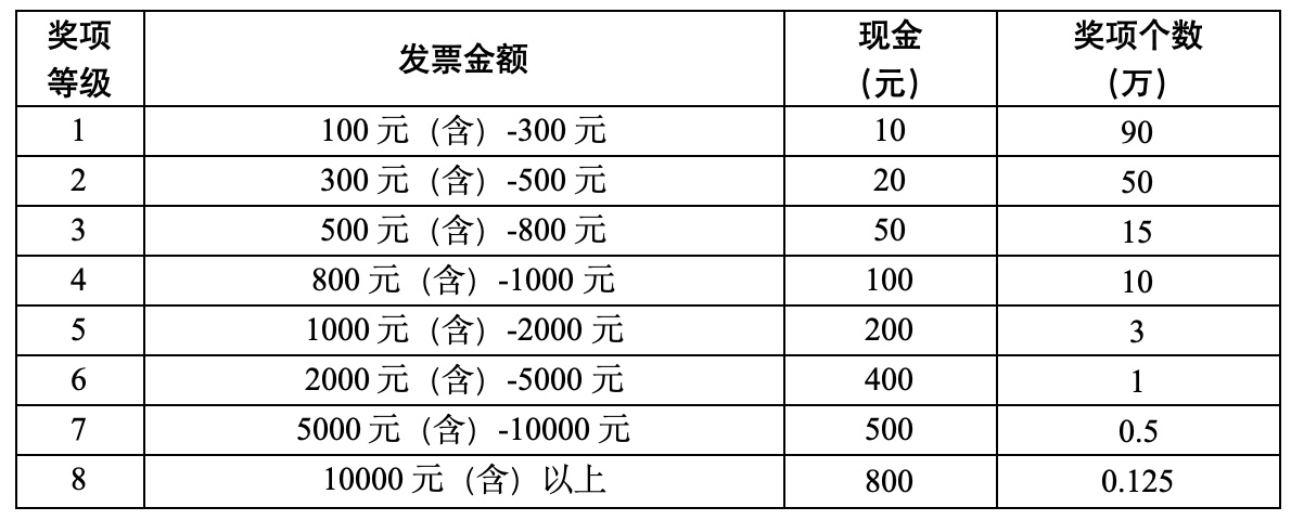 三期大抽奖,奖品实实在在!每期参与即开即奖的合格数电发票自动进入定期大奖池。每期设有4个奖项等级,采取实物奖品方式。