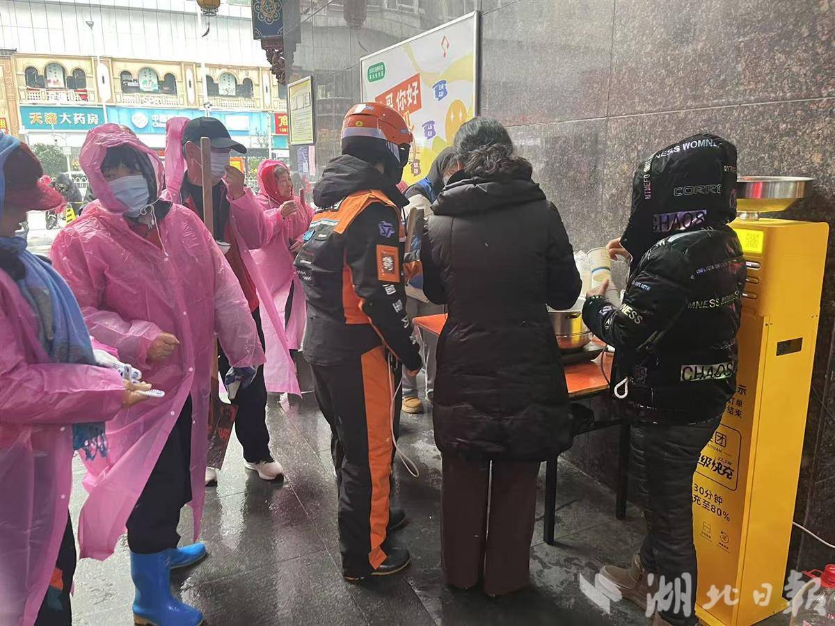 在汉阳汉商银座商圈,西大街社区志愿者小哥将“夏日送水点”变成“冬日姜茶点”,为更多户外工作者送上温暖,并上门为空巢独居老人送物资。