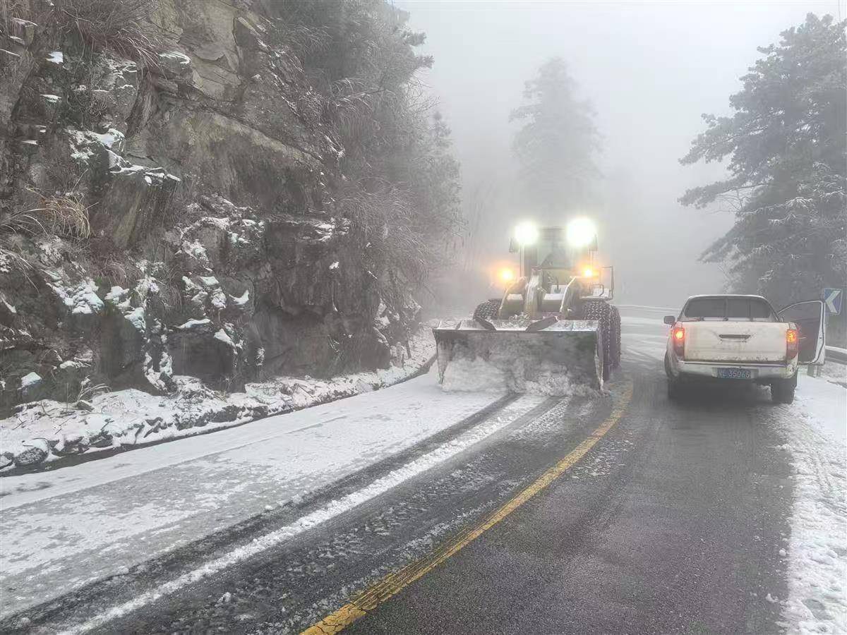 咸宁九宫山上山公路开展铲车扫雪除冰作业