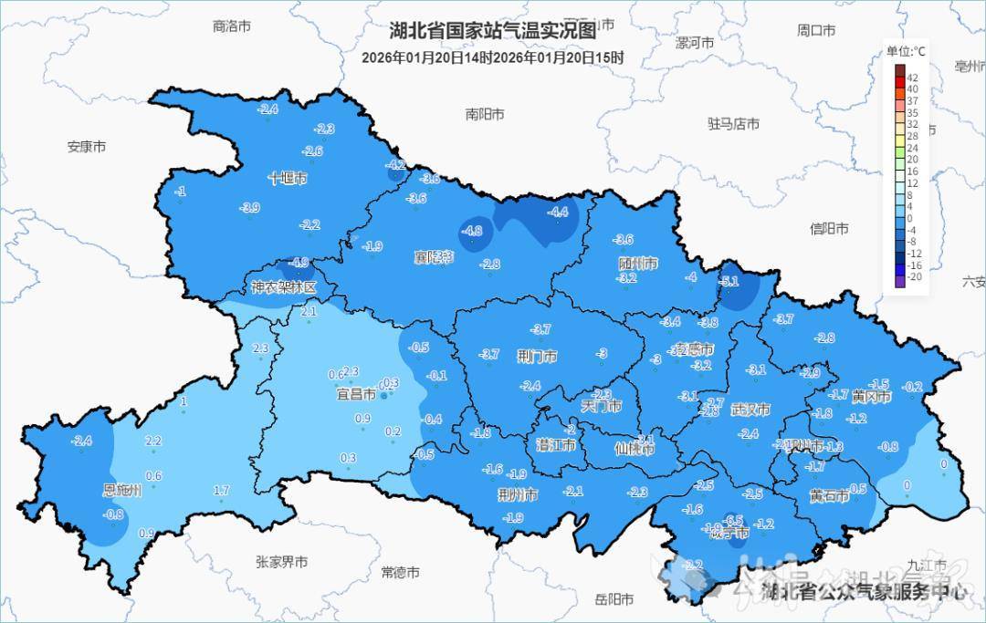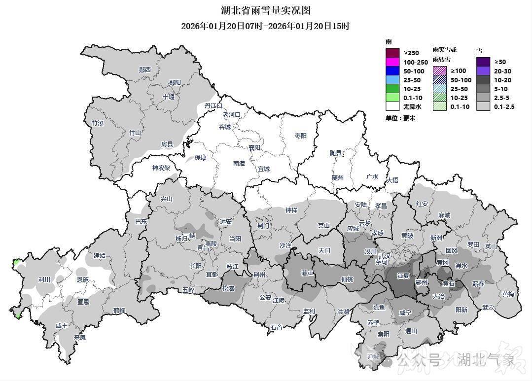 气象观测显示:20日7时至15时,鄂西南东部、江汉平原及鄂东地区出现小到中雪,其中武汉、鄂州、黄石北部等局地大雪,其他地区零星小雪。15时大部地区气温均在冰点以下,大悟仅-5.1℃。