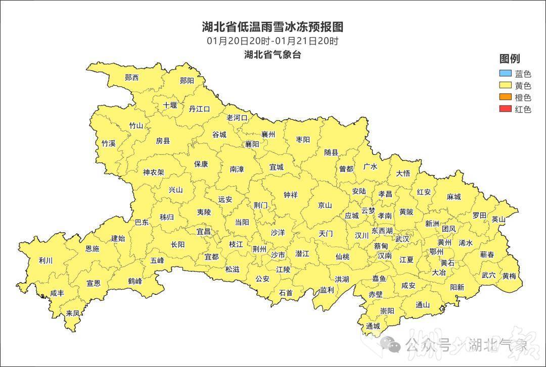 湖北日报讯(记者曾莉)1月20日进入“大寒”节气,随着寒潮影响的继续深入,湖北各地的雨水变成了漫天飞雪。15时25分,省气象台发布低温雨雪冰冻黄色省级预警,预计20日20时至21日20时,全省大部分地区有积雪,最低气温≤0℃,鄂西北、鄂西南、鄂东南部分地区仍有小雪。