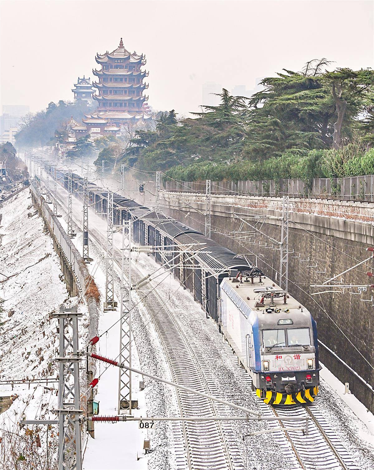 1月20日上午,武汉真的下雪了,许多市民游客来到武汉长江大桥,找到一个拍摄黄鹤楼、列车和雪同框的视角。
