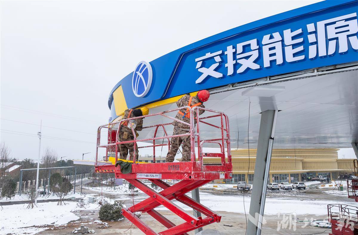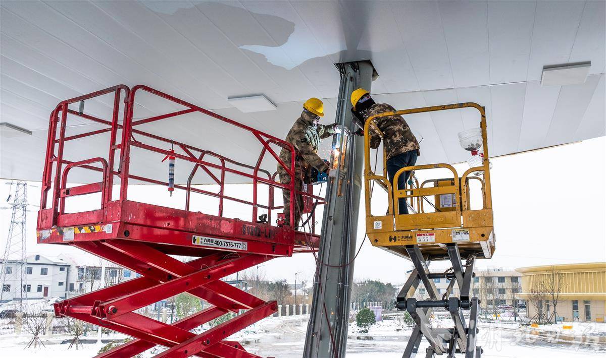 1月20日,武黄高速改扩建工程武昌鱼服务区,工作人员冒着严寒天气加紧施工。