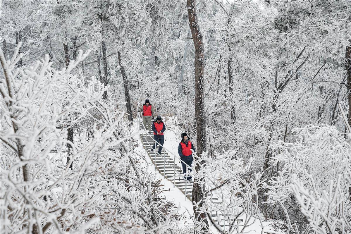 湖北日报讯 (记者黄磊、任勇、通讯员王欣、毛思哲、张恒)1月20日上午11时许,海拔800米的武汉之巅黄陂清凉寨,大雪纷飞、寒风凛冽。原本清晰的山路被厚厚的积雪覆盖,只留下深浅不一的脚印蜿蜒向前。