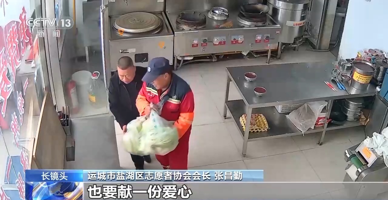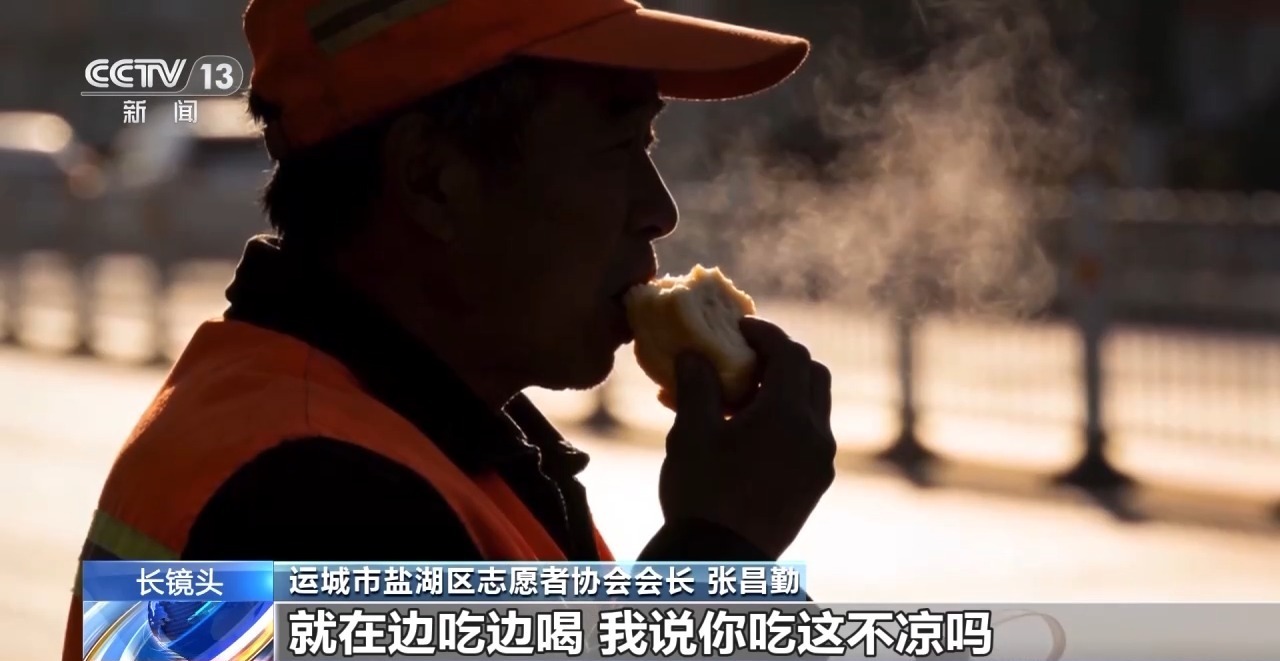 运城市盐湖区志愿者协会会长 张昌勤:那天也是早上刮着西北风,特别冷,那个大叔就是一个手拿着凉馒头,一个手拿着一瓶凉水,就在边吃边喝。我说你吃这不凉吗?他说凉啥凉,全当吃冰棍。