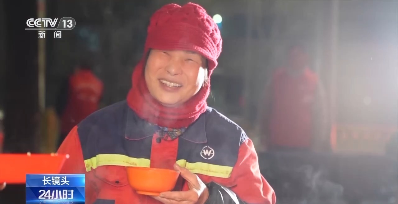 十几张餐桌围坐了120多名环卫工人,严寒与疲惫在这一刻荡然无存,又是一个温暖的清晨。