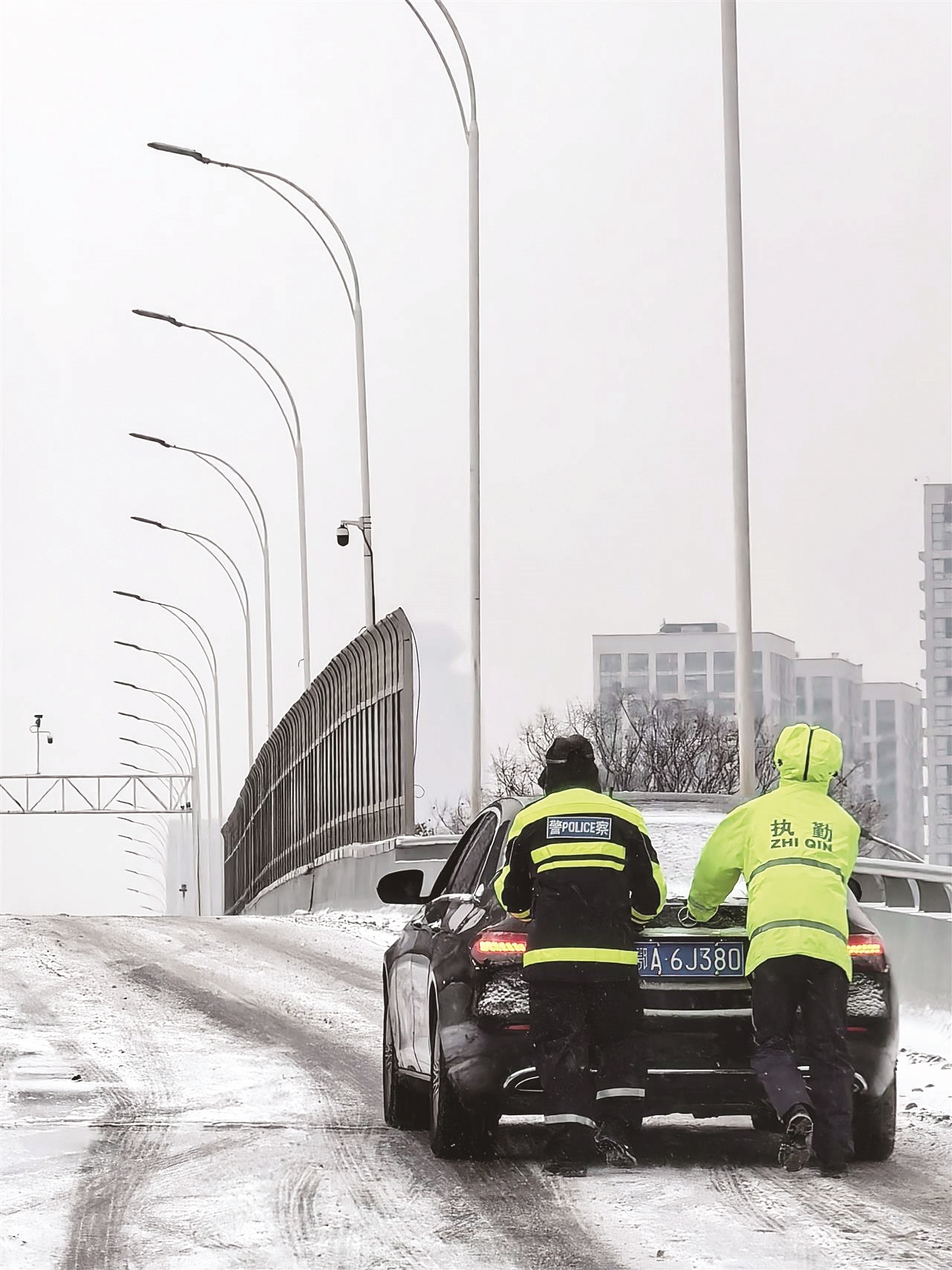 交警在高架桥上助打滑车辆脱困