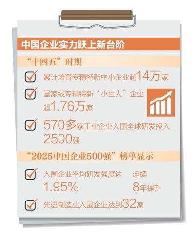 比亚迪是个缩影。勠力攻坚,中船集团摘下国产邮轮等造船业“皇冠上的明珠”;持续领跑,中国中车CR450动车组树起全球高铁装备新标杆;矢志创新,华为研发出自主可控的国产操作系统……新时代以来,植根于中国经济沃土的广大企业勇毅向前、一路生花,大企业“顶天立地”、中小企业“万马奔腾”、小微企业“生龙活虎”。“2025中国企业500强”榜单中,我国千亿规模企业数量增至267家,15家企业的营业收入超过万亿元,入围门槛实现23连升。