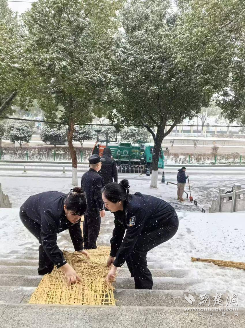 雪情预警传来,各单位迅速行动。安山街派出所提前与街道、高速收费站对接,制定巡查方案,清晨7时许就冒雪到达执勤岗位;纸坊派出所在户籍室连夜准备防滑草垫,“老年人多、台阶滑,这几卷草垫得铺扎实些”,民警辅警们踩着晨露将防滑草垫沿台阶铺成安全通道,边缘还细心压实以防打滑。